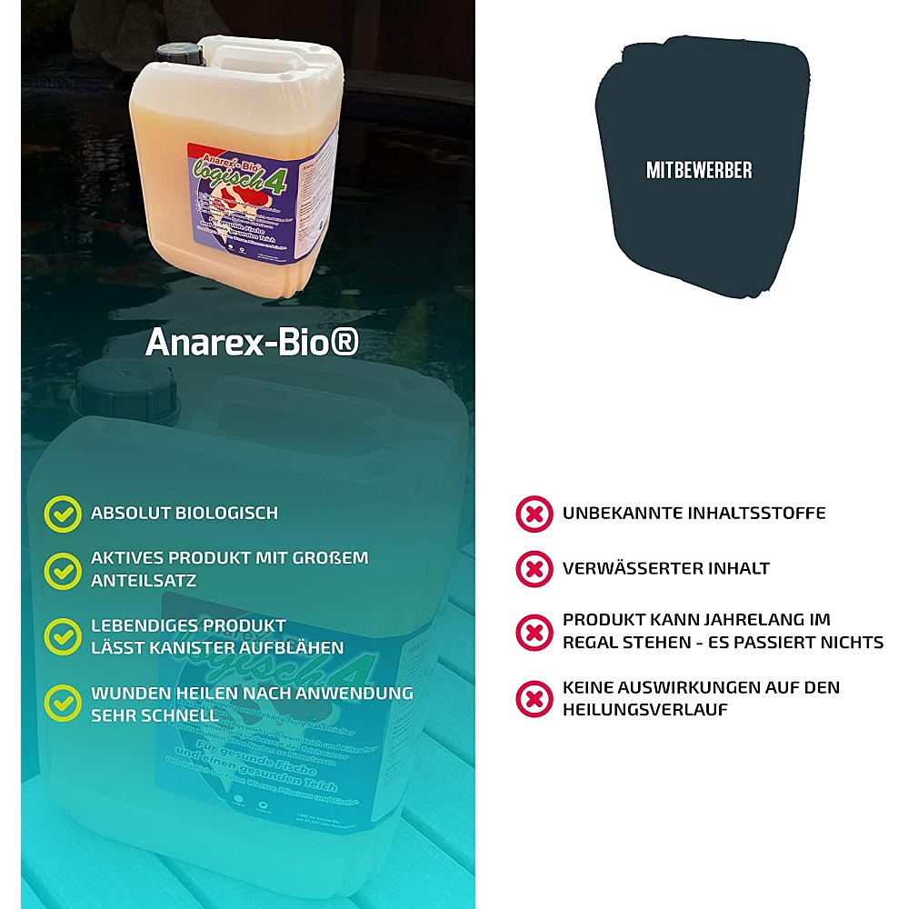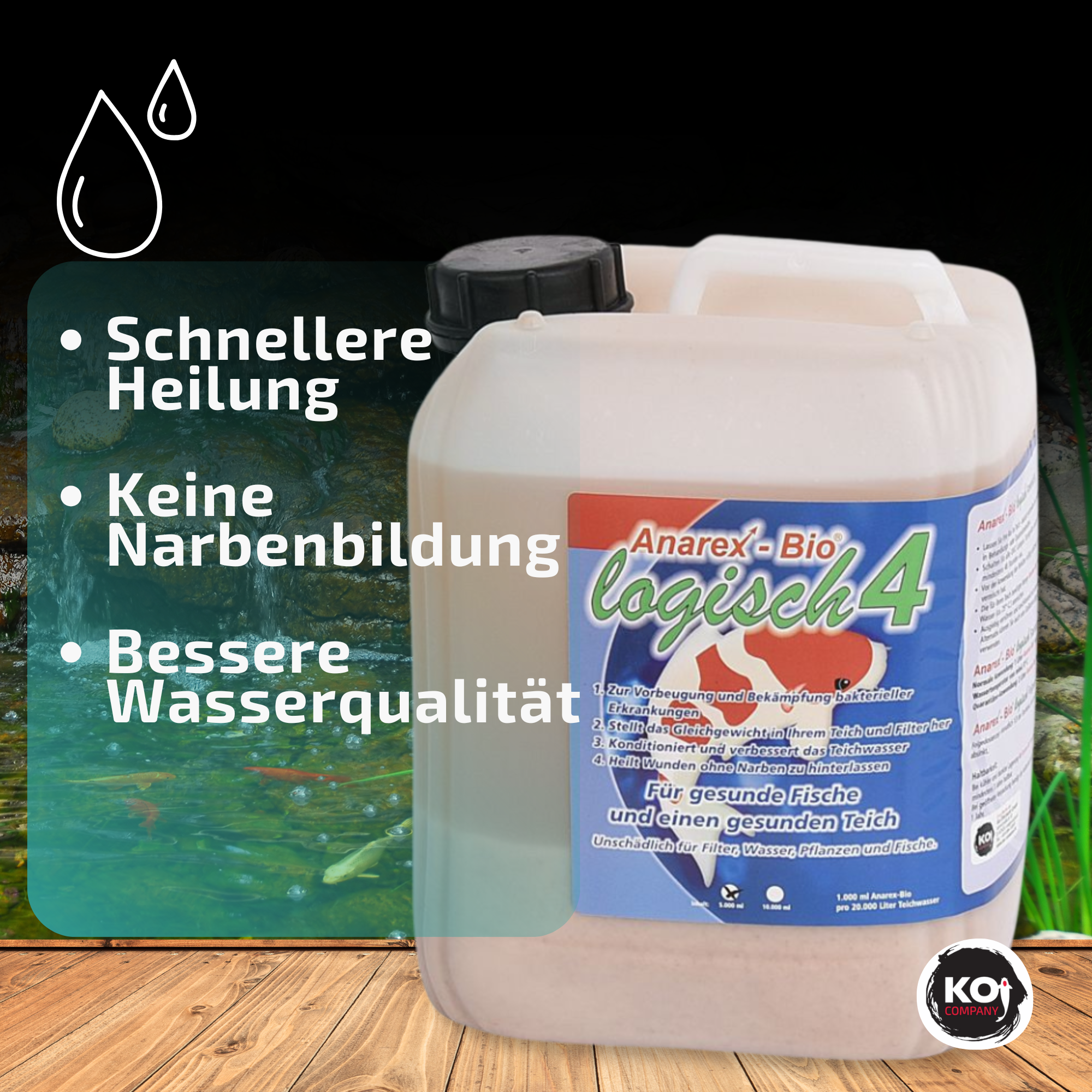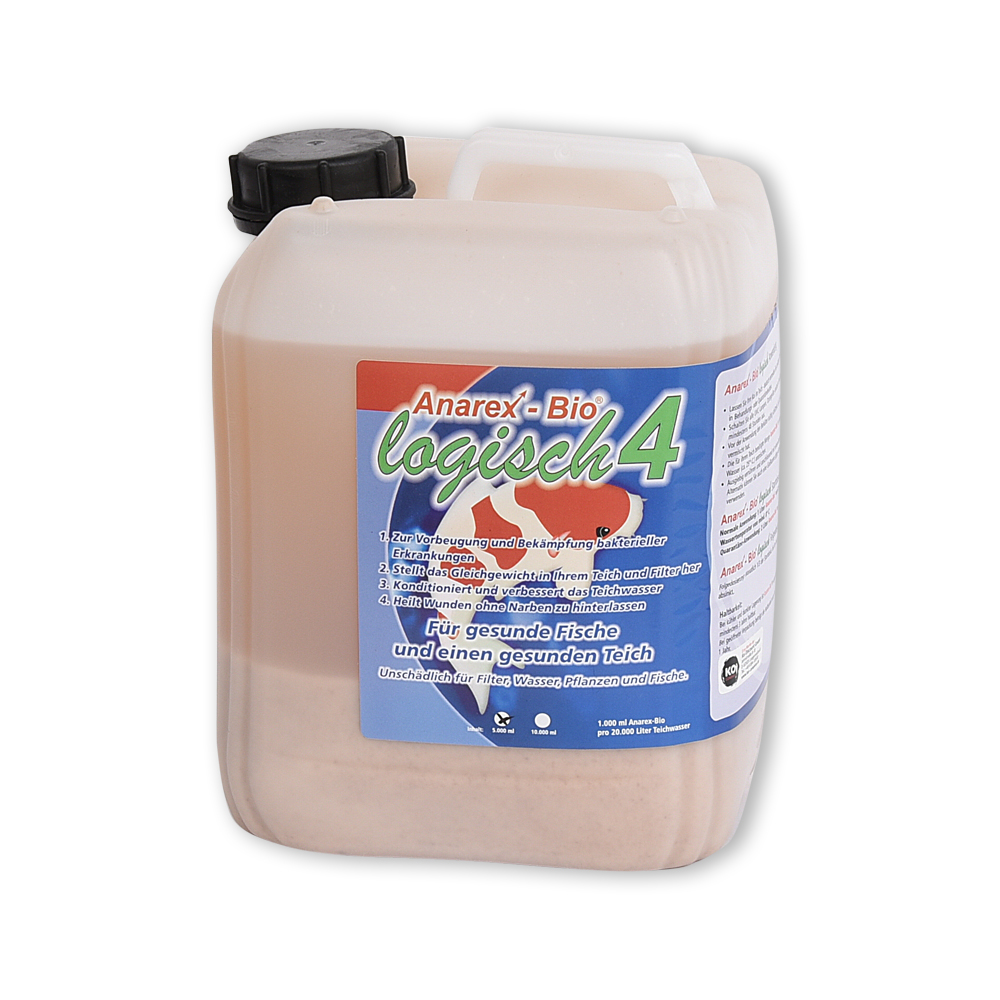 In erster Linie dient Anarex-Bio® logisch4 der Vorbeugung bakterieller Erkrankungen und unterstützt außerdem die Genesung Ihrer Koi – ohne Hinterlassung von Narben. Darüber hinaus stellt Anarex-Bio® logisch4 das bakterielle Gleichgewicht in Ihrem Teich und Filter wieder her und verbessert die Wasserqualität Ihres Teichwassers.