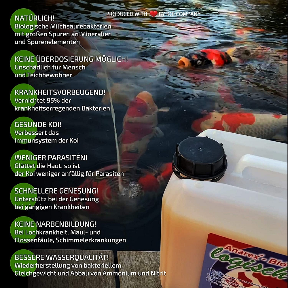 Anarex-Bio® vernichtet 95% der krankheitserregenden Bakterien, wodurch sich das Risiko von Krankheiten reduziert. Außerdem beschleunigt es den Abbau von Abfallstoffen, wodurch die Wirkung Ihres Filters erhöht wird. Darüber hinaus verstärkt Anarex-Bio® nicht nur das Abwehrsystem Ihrer Koi sondern glättet auch noch deren Haut, wodurch Ihre Koi erheblich weniger Schwierigkeiten mit Parasiten haben.
