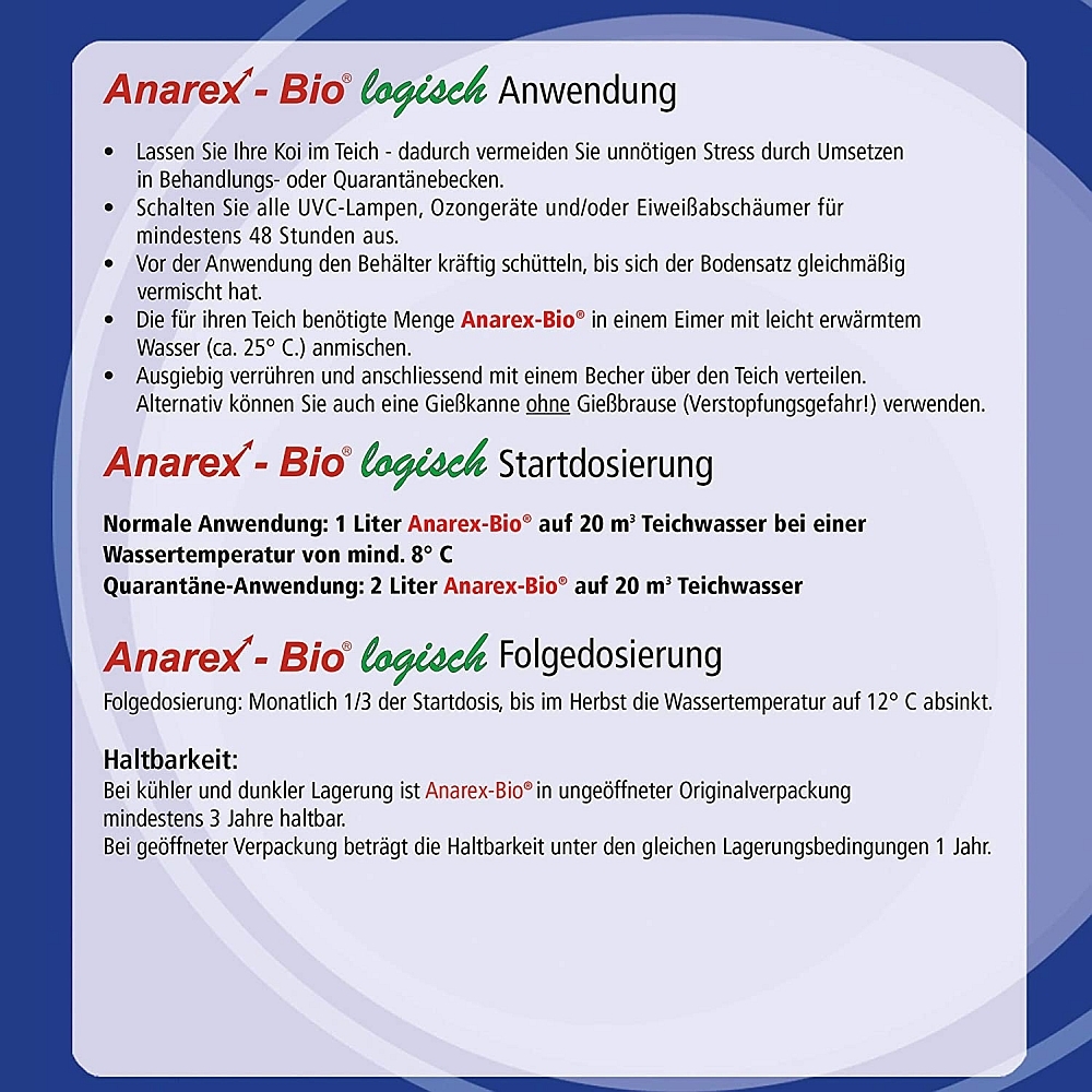Sie benötigen 1 Liter Anarex-Bio® pro 20.000 Liter Teichvolumen, inklusive Filter und Pflanzenfilter. Danach jeden Monat 1/3 Liter Anarex-Bio® pro 20.000 Liter Teichvolumen bis zum Ende der Saison zufügen. Eine Überdosierung ist nicht möglich. Bei einer Anwendung in der Quarantäne benötigen Sie 2 Liter Anarex-Bio® pro 20.000 Liter Volumen.