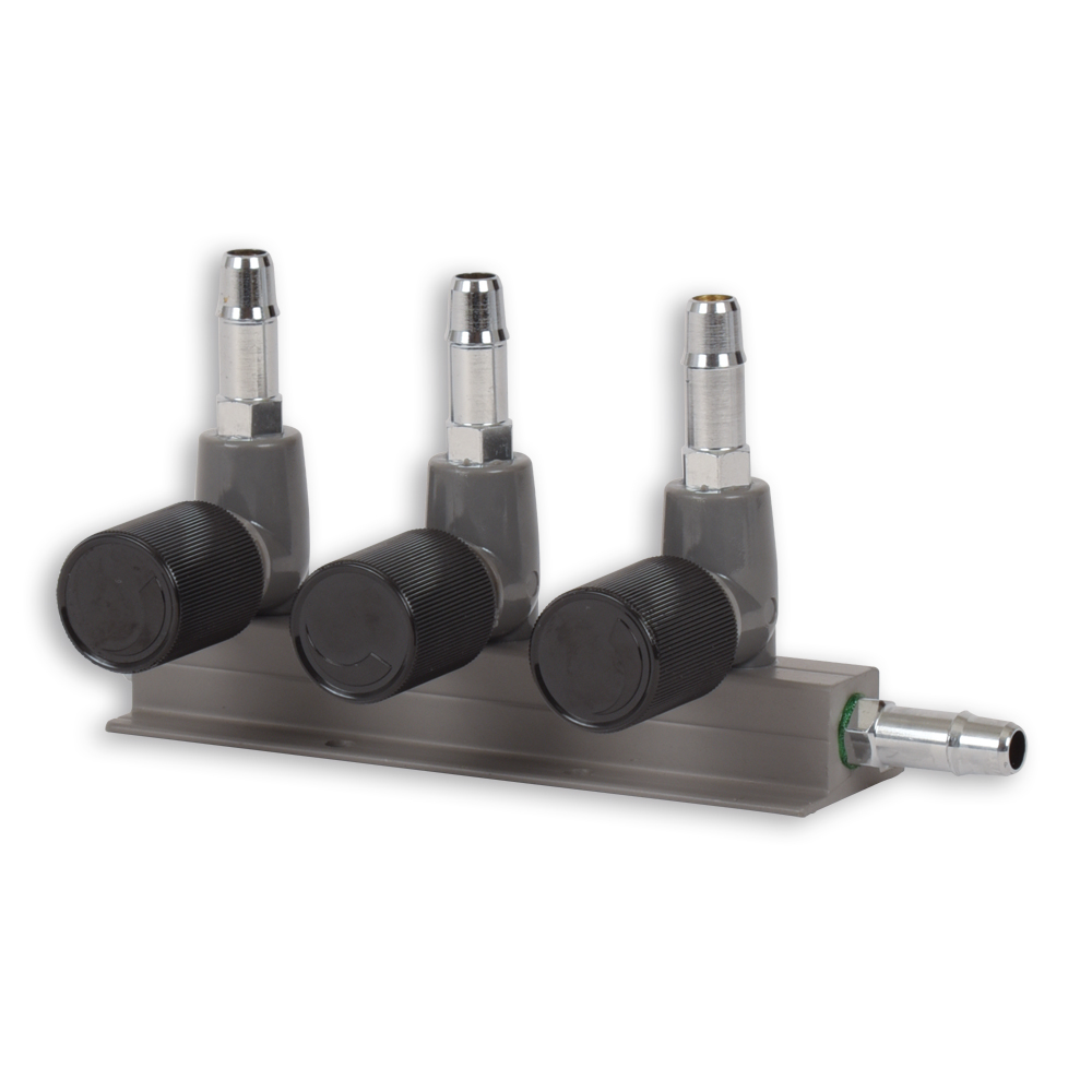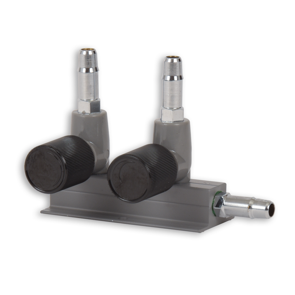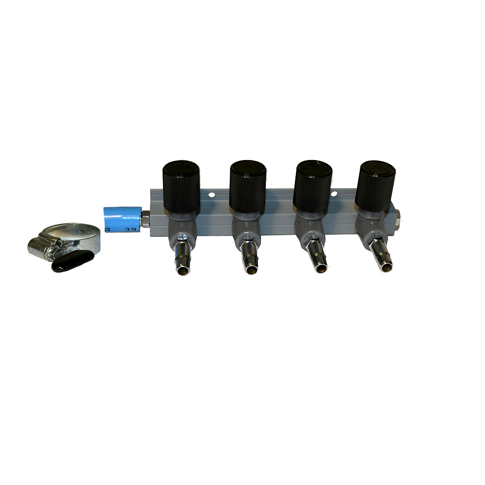 Der Verteiler hat einen 9mm Eingang sowie 9mm Ausgänge an jedem Hahn. Jeder Ausgang kann einzeln justiert werden. Jeder Verteiler wird mit einem Adapterschlauch geliefert, damit er in den Gummi-Winkelschlauch passt. Er ist mit Bohrlöchern versehen, um ihn an einer Wand zu fixieren.