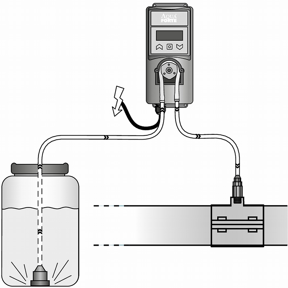 Es bietet sich an die Dosierpumpe mit unserer Anbohrschelle und dem dazu passenden Reduziernippel 3/4“ x 3/8“  (Art. Nr. 82497 für Anbohrschelle) zu verwenden. So kann die zu Dosierende Flüssigkeit direkt in die Rohrleitung des Teiches eingebracht werden.