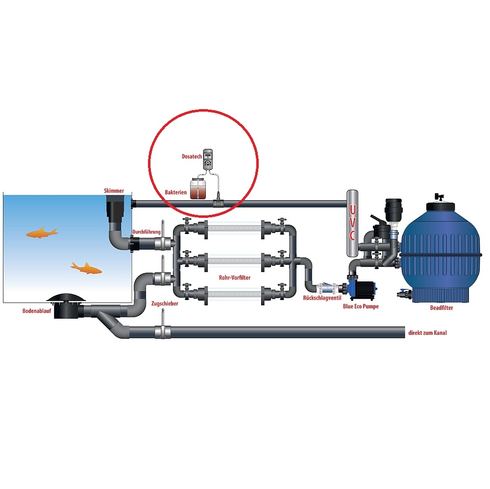 Der Einsatz der Dosierpumpe ist viel effektiver als die Mittel einmal monatlich in den Teich zu geben.