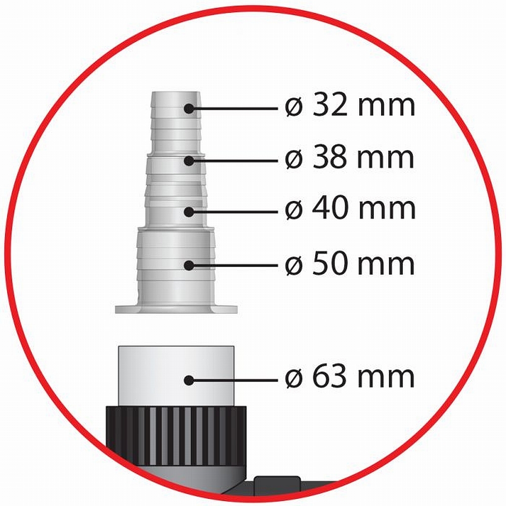 • Anschluss mit 32/38/40/50mm Schlauch, 63/50mm Verrohrung oder 1 1/2" Außengewinde möglich