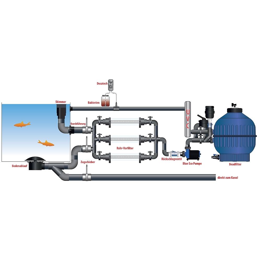 Bei der Nutzung im Schwerkraftsystem sollte aufgrund des Durchmessers der Rohr-Vorfilter kurz vor der Pumpe montiert werden, damit genügen Durchfluss gewährleistet wird.