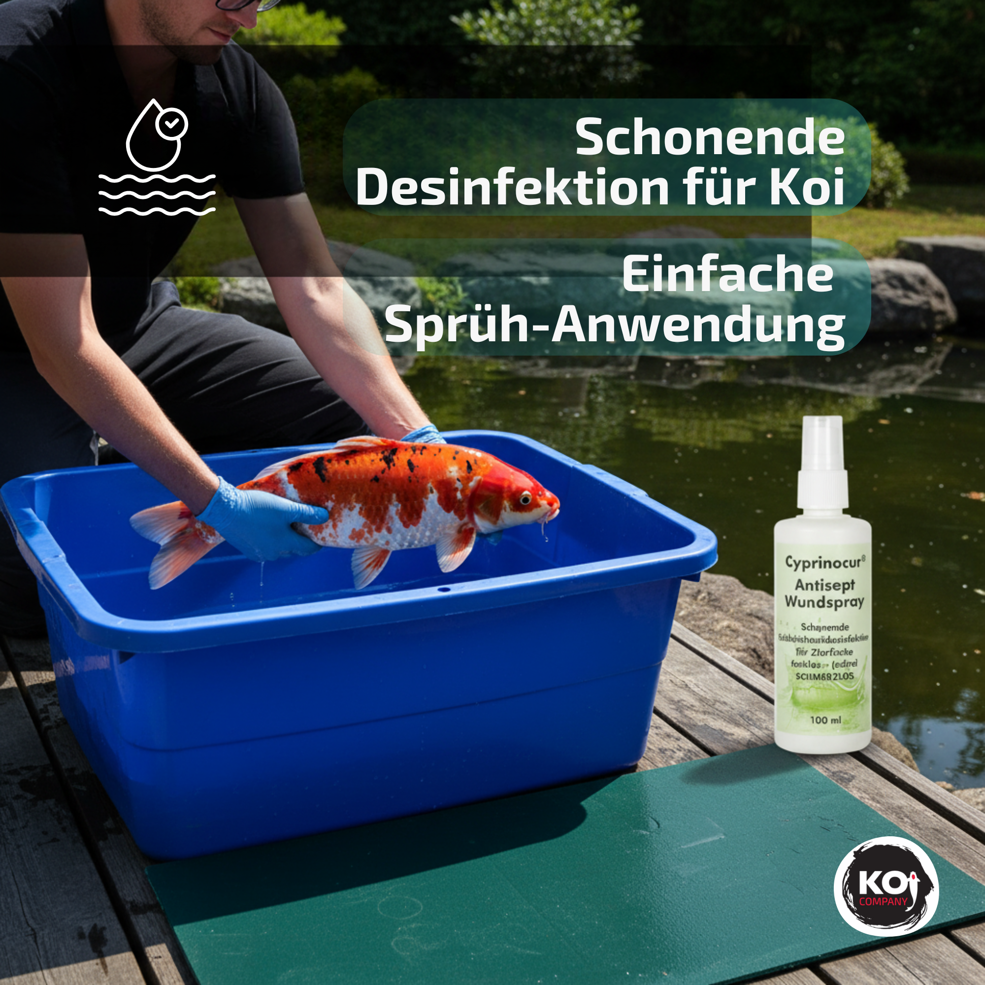 Cyprinocur Antisept wurde entwickelt, um dem Koi Halter die Möglichkeit zu geben, Wunden schnell und schonend zu desinfizieren. Es enthält weder Jod noch Schwermetalle, der Alkoholgehalt konnte durch die Kombination verschiedener Wirkstoffe auf 10% gesenkt werden. Cyprinocur Antisept ist gegen ein breites Spektrum von Bakterien, Viren und Pilzen wirksam.