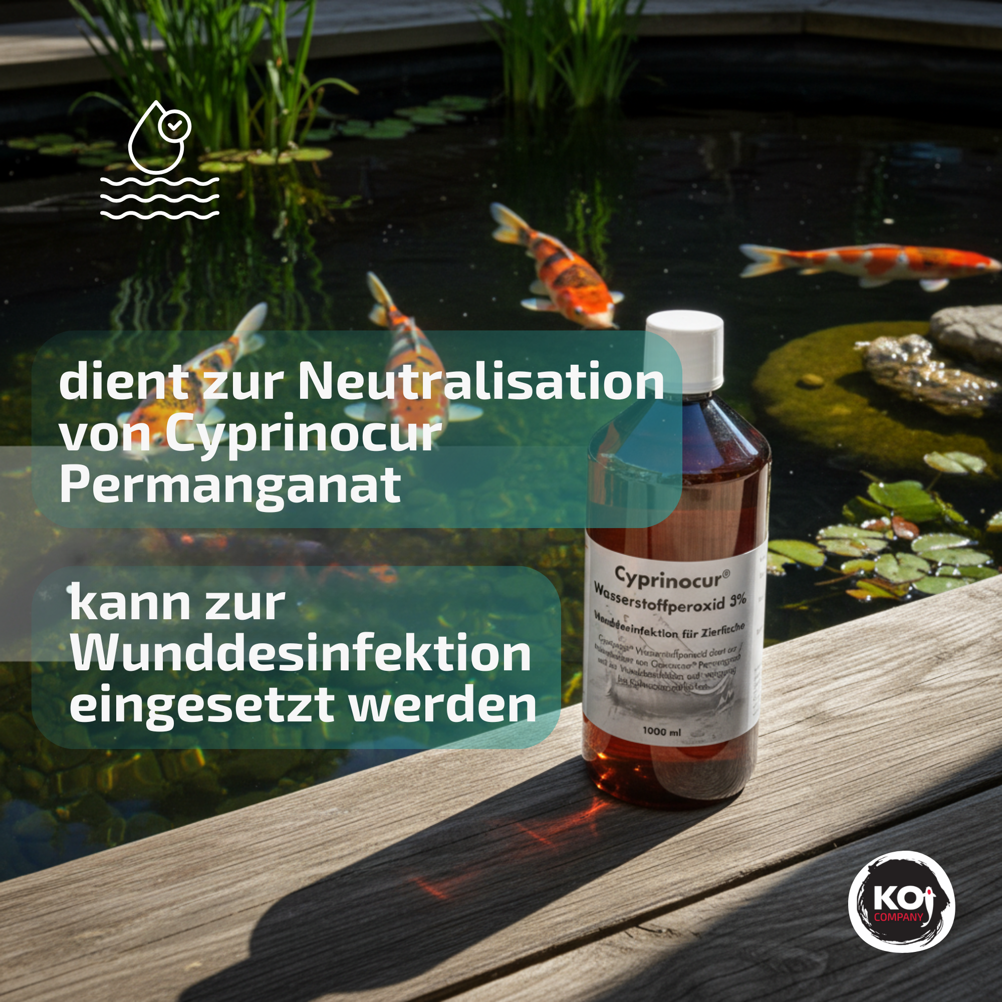 Zur Neutralisation von Cyprinocur Permanganat werden 20 ml Cyprinocur Wasserstoffperoxid auf 1.000 l Teichvolumen gegeben.