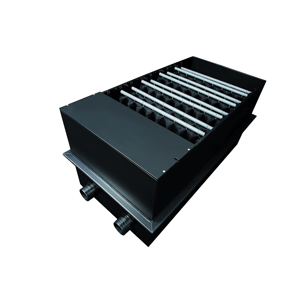 Mit dem EVO Brush, der Neukonzeption des althergebrachten Bürstenfilters. Dabei wird das in den FIlter einströmende Wasser im Mehrkammerprinzip abwechselnd von oben nach unten durch den Filter geleitet oder kann (zumindest solange die Bürsten noch sauber sind) den kürzesten Weg durch die Bürste wählen. Bis es schließlich nach etwa zwei Meter Filterlänge und einem zurückgelegten Filterweg von 8 Meter bei den im Filter integrierten Pumpen und UVC-Lampen (nicht im Auslieferungszustand enthalten) angekommen ist, wurde es vollständig von sämtlich sichtbaren Verunreinigungen befreit und biologisch aufbereitet.