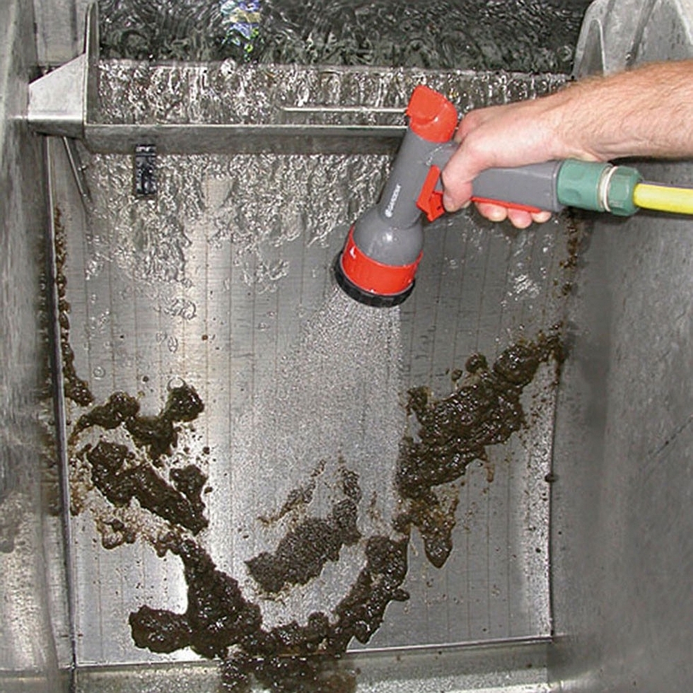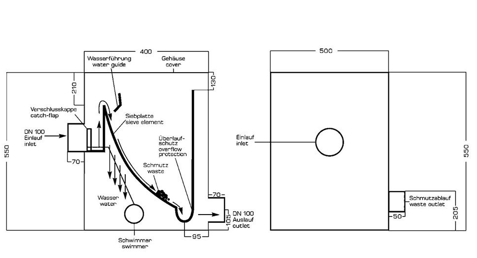 Der Spalt Active 22.000 hat einen 160 mm Eingang und Ausgang. Dies ermöglicht einen maximalen Durchfluss von 22.000 Litern in der Stunde. An der Seite befindet sich ein 110 mm Schmutzausgang.