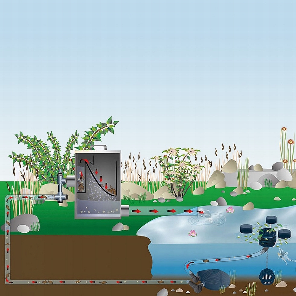 Sehr einfache Anwendung: Eine Tauchpumpe wird im Teich platziert. Mittels Schlauch wird die Pumpe an dem Siebfilter angeschlossen. Das Wasser fällt durch das Sieb und der Schmutz, welcher größer als 0,30mm ist bleibt auf dem Sieb liegen.