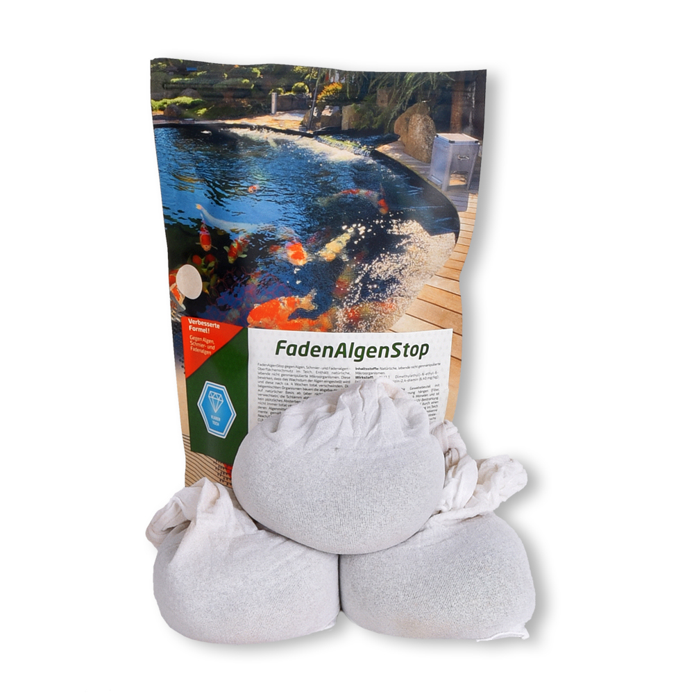 Dieses Produkt enthält eine Mischung aus verschiedenen Mineralien und Mikroorganismen. Diese bewirken, dass das Wachstum der Algen eingestellt wird und diese nach ca. 4 Wochen total verschwinden. Die beigemischten Organismen bauen die abgebauten Algen auf natürlicher Basis ab (bitte nicht mit Bakterien verwechseln, die Schlamm abbauen sollen). Es erfolgt kein plötzliches Absterben der Algen, so dass der Filter nicht komplett verschmutzt wird, wie wir es von anderen Algenmitteln kennen. Sie erhalten Fadenalgenstop in einem Gewebebeutel, den Sie einfach in die Strömung hängen (Filter, Bachlauf).