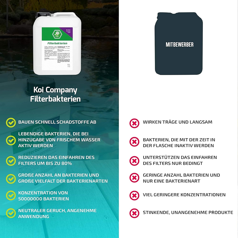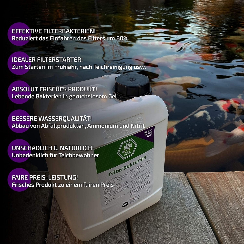 Untersuchungen der Universität in Gießen haben gezeigt, die Filterbakterien von Koi Company enthalten eine sehr große Anzahl von Nitrifikationsbakterien und eine große Varietät von Stämmen. Sie erhalten ein Top Produkt zu einem phantastischen Preis-Leistungs-Verhältnis.