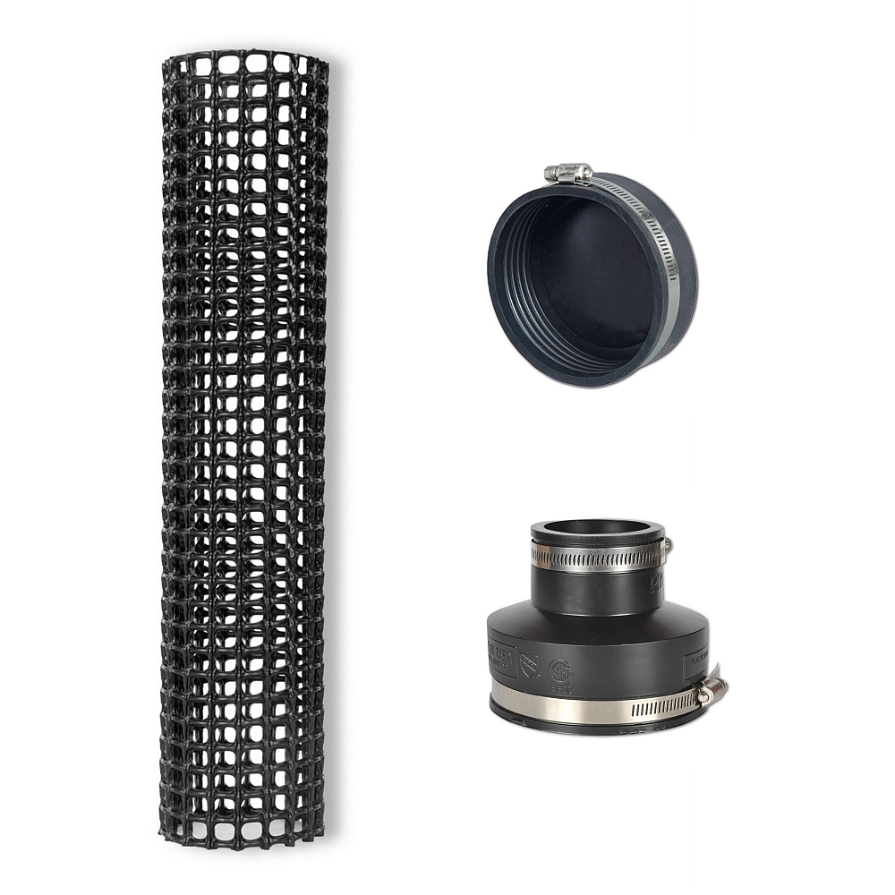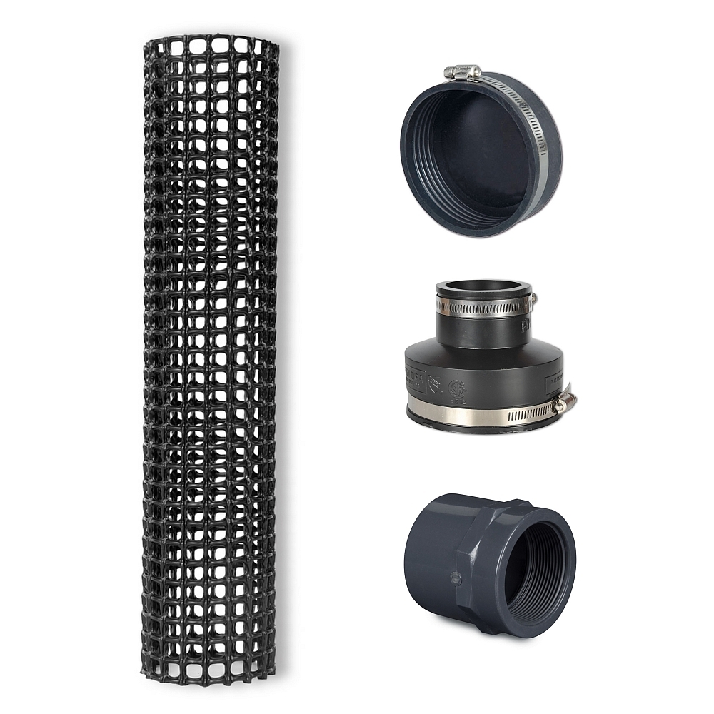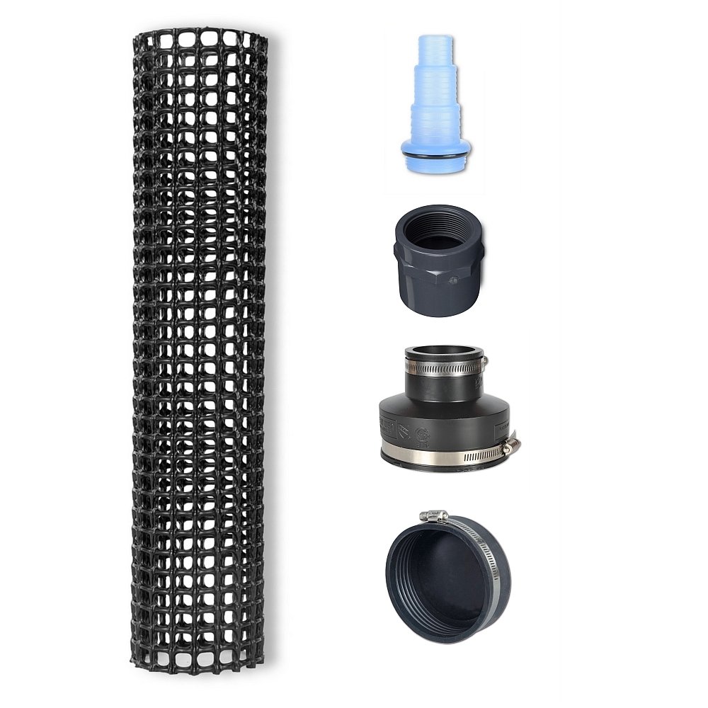 Ein weiteres Einsatzgebiet des Filterrohres ist die Verwendung als Schmutzkorb. Für eine Pumpe kann das Rohr direkt aufgeschraubt werden. Dafür bestellen Sie die flexible Reduziermuffe mitsamt einer Gewindemuffe, die für Ihre Pumpe passend ist. Dann drehen Sie das Rohr einfach drauf.