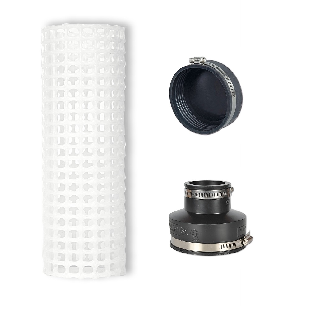 Es besteht natürlich auch die Möglichkeit, das Filtersiebrohr an eine kleinere Verrohrung anzuschließen, z.B. 50 oder 63 mm. Dann bestellen Sie eine flexible Endkappe für die eine Seite und eine flexible Reduziermuffe für die andere Seite, die Sie an einem Rohr festmachen.