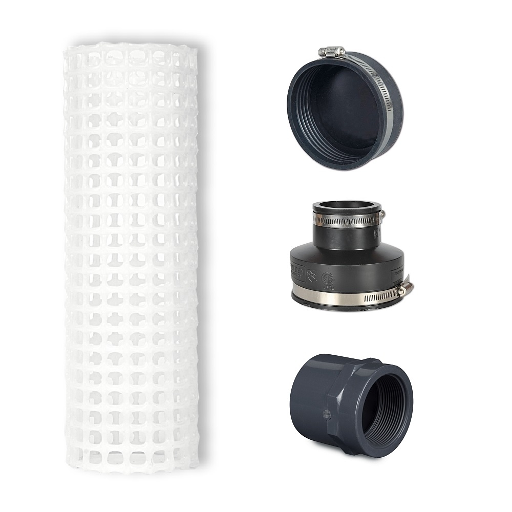 Ein weiteres Einsatzgebiet des Filterrohres ist die Verwendung als Schmutzkorb. Für eine Pumpe kann das Rohr direkt aufgeschraubt werden. Dafür bestellen Sie die flexible Reduziermuffe mitsamt einer Gewindemuffe, die für Ihre Pumpe passend ist. Dann drehen Sie das Rohr einfach drauf.