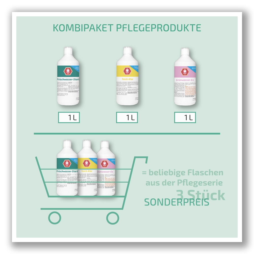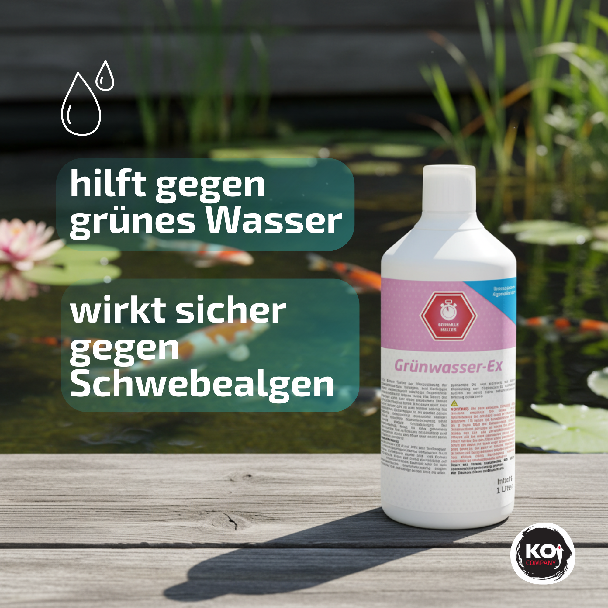 Grünwasser-Ex ist speziell gegen grünes Wasser entwickelt worden. Seine spezielle Zusammensetzung wirkt sicher gegen Schwebealgen. Die anfallende Ausflockung wird entweder durch den Filter oder einen Kescher entfernt.