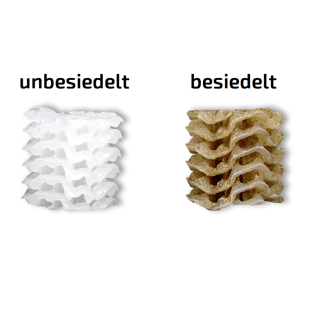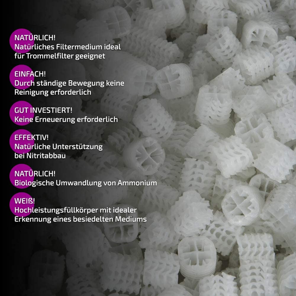 Das Hel-X® 17 KLL Filtermedium sorgt für eine gute Wasserqualität in Ihrem Teich bei höchstmöglicher Abbauleistung in der Nitrifikation. So eignet sich das Hel-X® 17 KLL Filtermedium sehr gut für den Abbau von Ammonium und Nitrit in der letzten Filterkammer (Klarwasser) und erfordert durch die ständige Bewegung keine Reinigung und muss nicht erneuert werden. Außerdem kann das Hel-X® 17 KLL Teichfilter-Material zur biologischen Abwasseraufbereitung verwendet werden.