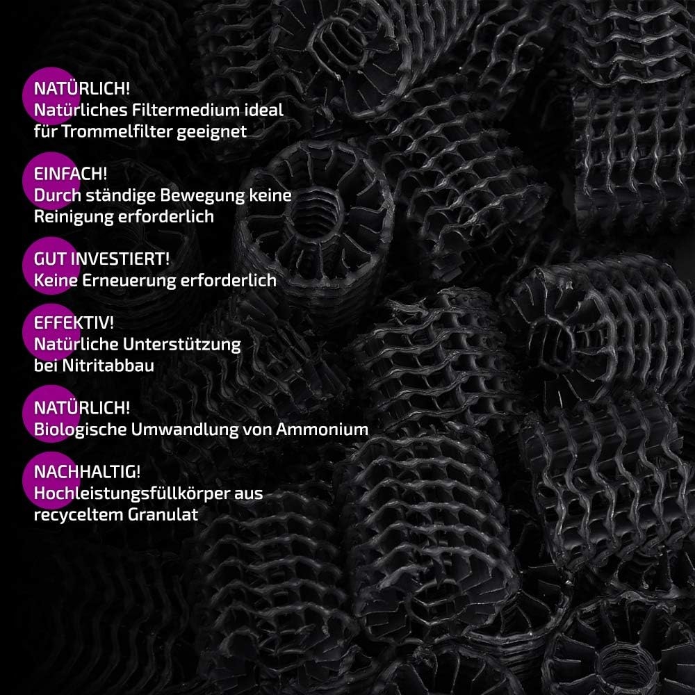 Das Hel-X® H2X36 Filtermedium sorgt für eine gute Wasserqualität in Ihrem Teich bei höchstmöglicher Abbauleistung in der Nitrifikation. So eignet sich das Hel-X® H2X36 Filtermedium sehr gut für den Abbau von Ammonium und Nitrit in der letzten Filterkammer (Klarwasser). Desweiteren kann das Hel-X® H2X36 Teichfilter-Material zur biologischen Abwasseraufbereitung verwendet werden.