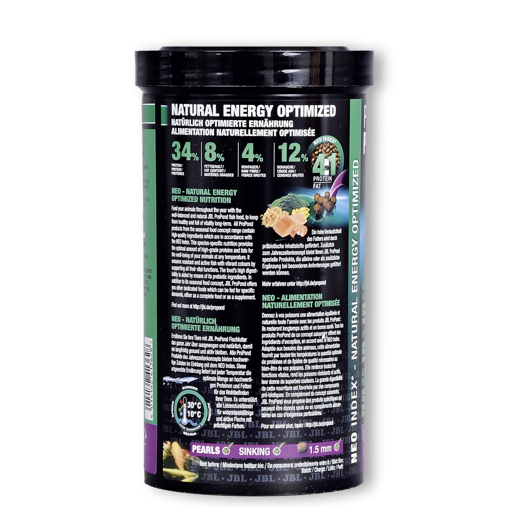 JBL ProPond Biotopfutter ist ein Ganzjahresfutter, welches in allen vier Jahreszeiten gefüttert werden kann (10-30 °C Wassertemperatur). Das Protein-Fettverhältnis ist ausgewogen aufeinander abgestimmt.