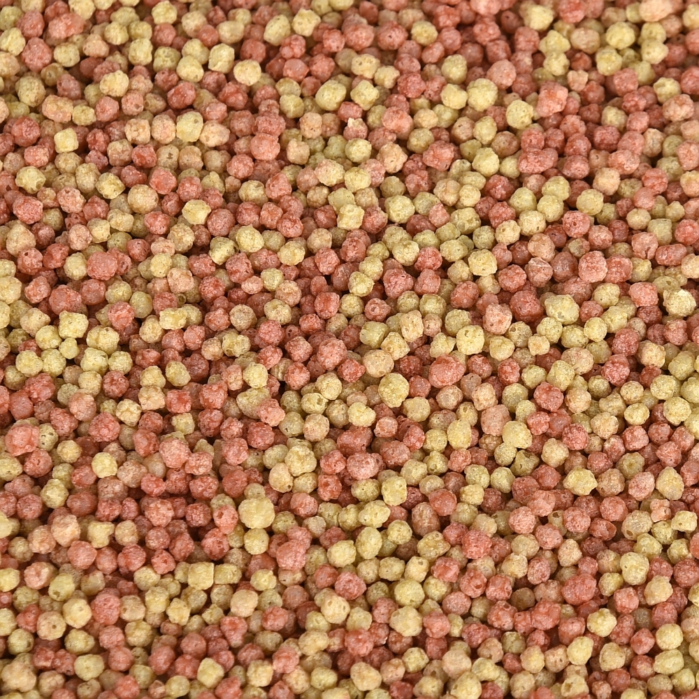 Zusammensetzung: Maismehl, Weizenmehl 30%, Reismehl, Lachsmehl, Sojamehl, Weizenkeimmehl 6%, Garnelenmehl 2%, Spinatmehl 2%