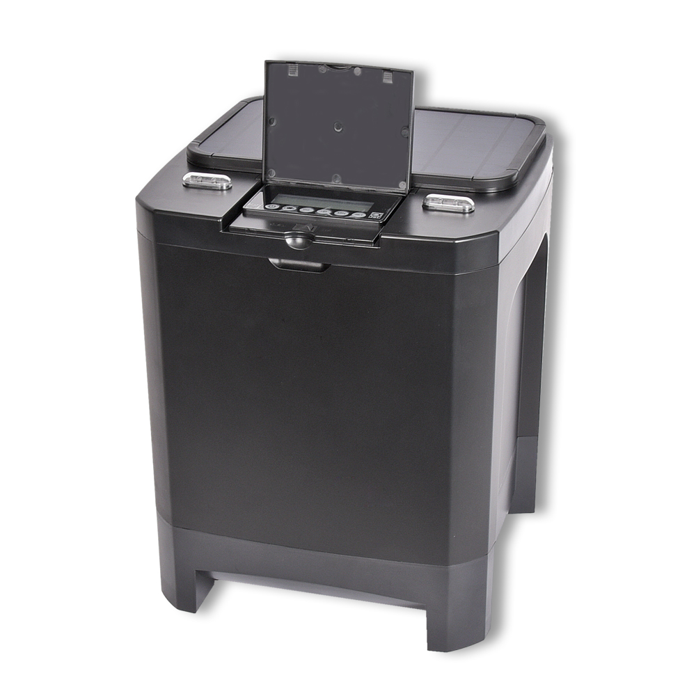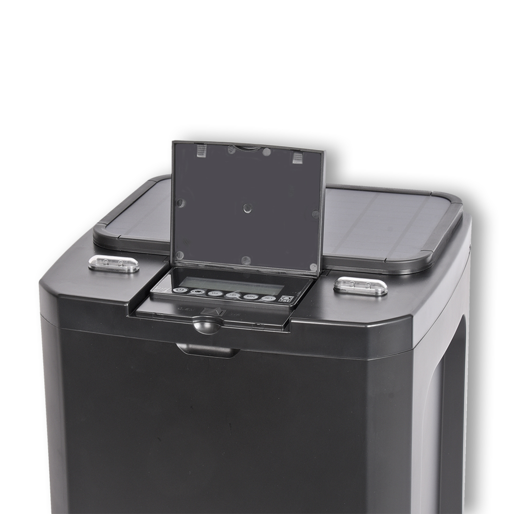 Durch die integrierte Steuerung können bis zu 24 Fütterungszeiten täglich und die jeweilige gewünschte Futtermenge (10-stufig) eingestellt werden. Ein manueller Auswurf auf Knopfdruck ist ebenso möglich.