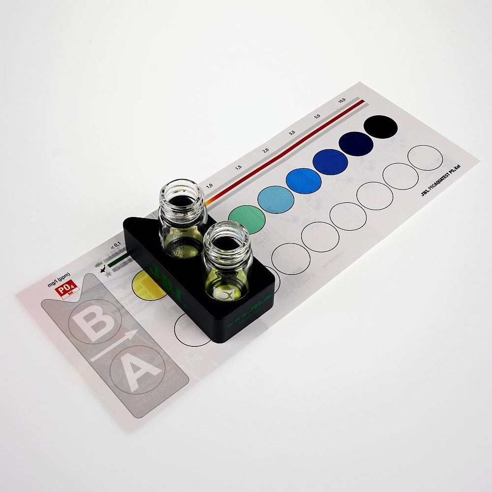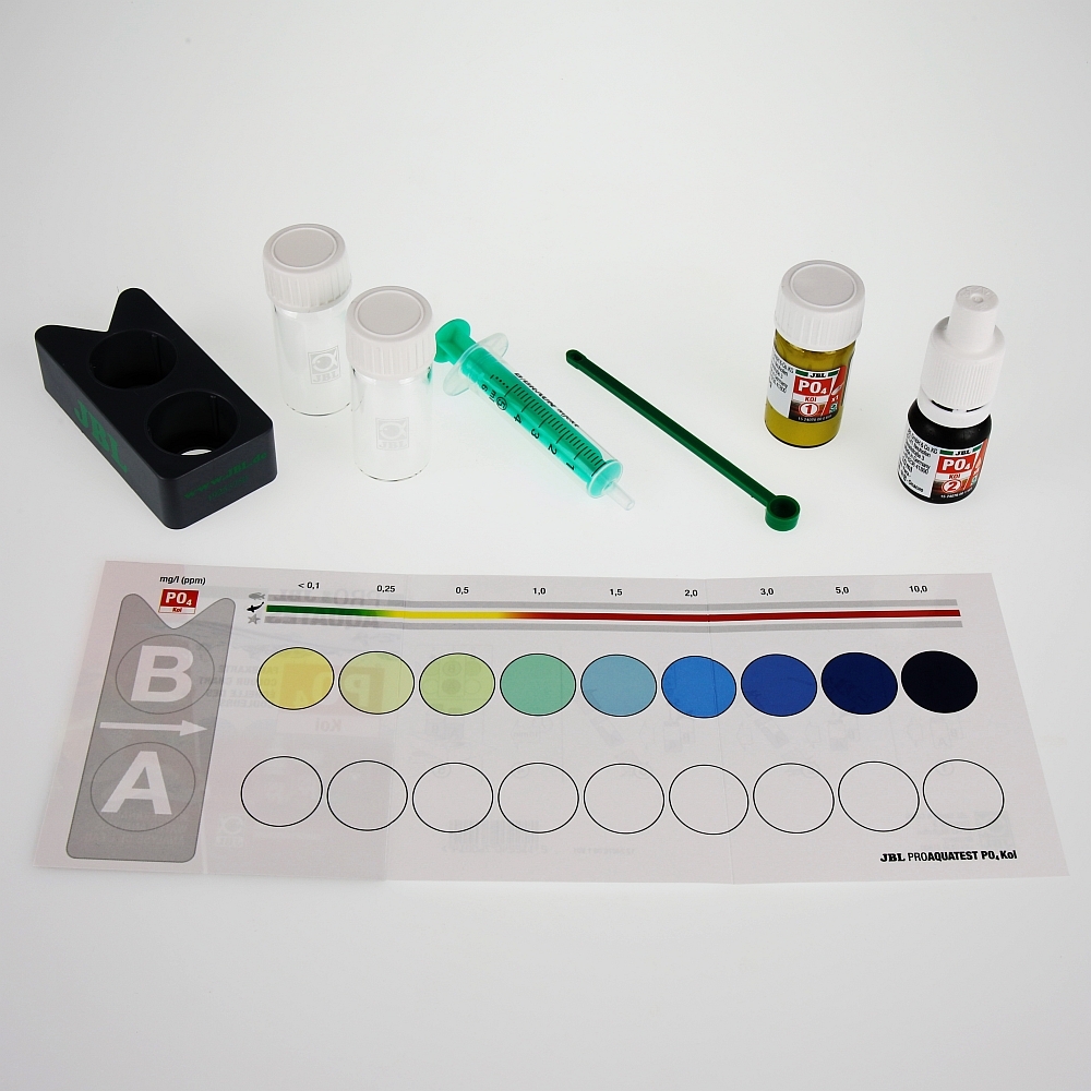 Inhalt: Schnelltest, Phosphat Test PO4, Inkl. Reagenzien, Glasküvetten mit Schraubverschluss, Spritze, Dosierlöffel, Komparatorblock und Farbskala.