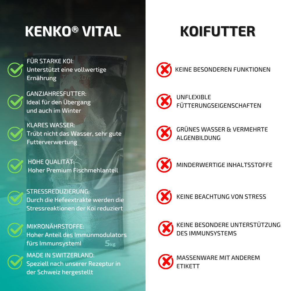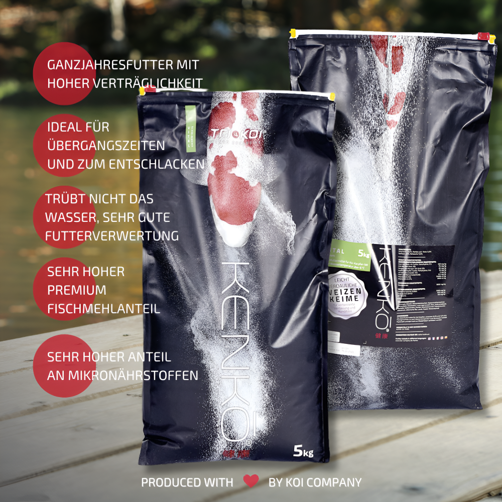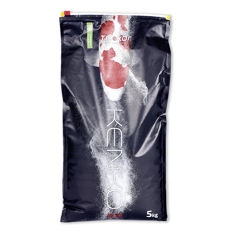 Und darum geht es bei diesem Futter hauptsächlich. Wir haben die Rezeptur beim Kenko® Vital verändert und gleichen das Futter auch kälteren Temperaturen an, damit Sie ein sehr hochwertiges Futter haben, welches ein perfektes Ganzjahresfutter ist. Sie können es auch gut in den Übergangszeiten und im Winter verfüttern. Durch seine Mikronährstoffe und Immunstimulanzien garantiert dieses Futter eine außergewöhnliche Vitalität Ihrer Koi. Die Abwehrkräfte Ihrer Fische werden gestärkt. Ältere Koi, die Ihre Gesamtgröße erreicht haben und nicht mehr wachsen sollen, können mit diesem Futter perfekt gefüttert werden.
