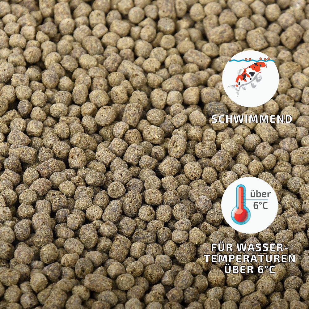 Gerade in Übergangszeiten und bei Futterumstellungen können Sie diese Sorte wunderbar mit einmischen. Bei Ammoniak- und Nitritproblemen können Sie das Futter einwandfrei verwenden, da der verringerte Eiweißgehalt den Filter schont. Nach Medikamentierungen oder Stresssituationen kann dieses Futter verfüttert werden, um Ihren Filter und Ihre Koi zu schonen.