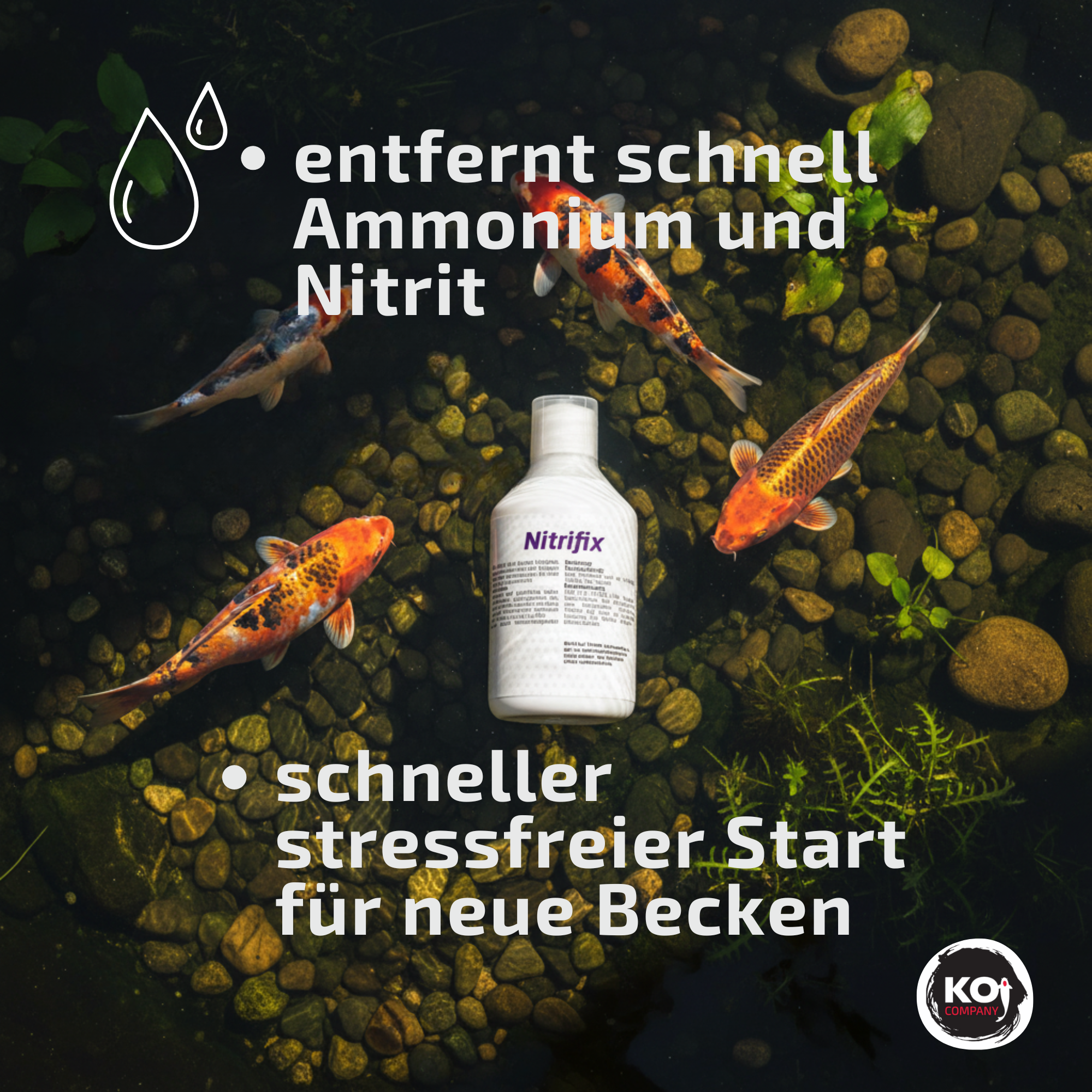 Folgedosierung: 100 ml Koi Company Nitrifix auf 10.000 Liter Teichwasser 1 x pro Woche/Monat. Der Zeitpunkt ist abhängig vom biologischen Gleichgewicht Ihres Teiches. Bei einer zu hohen Besatzdichte benutzen Sie Nitrifix öfter als bei einem kleinen Besatz.