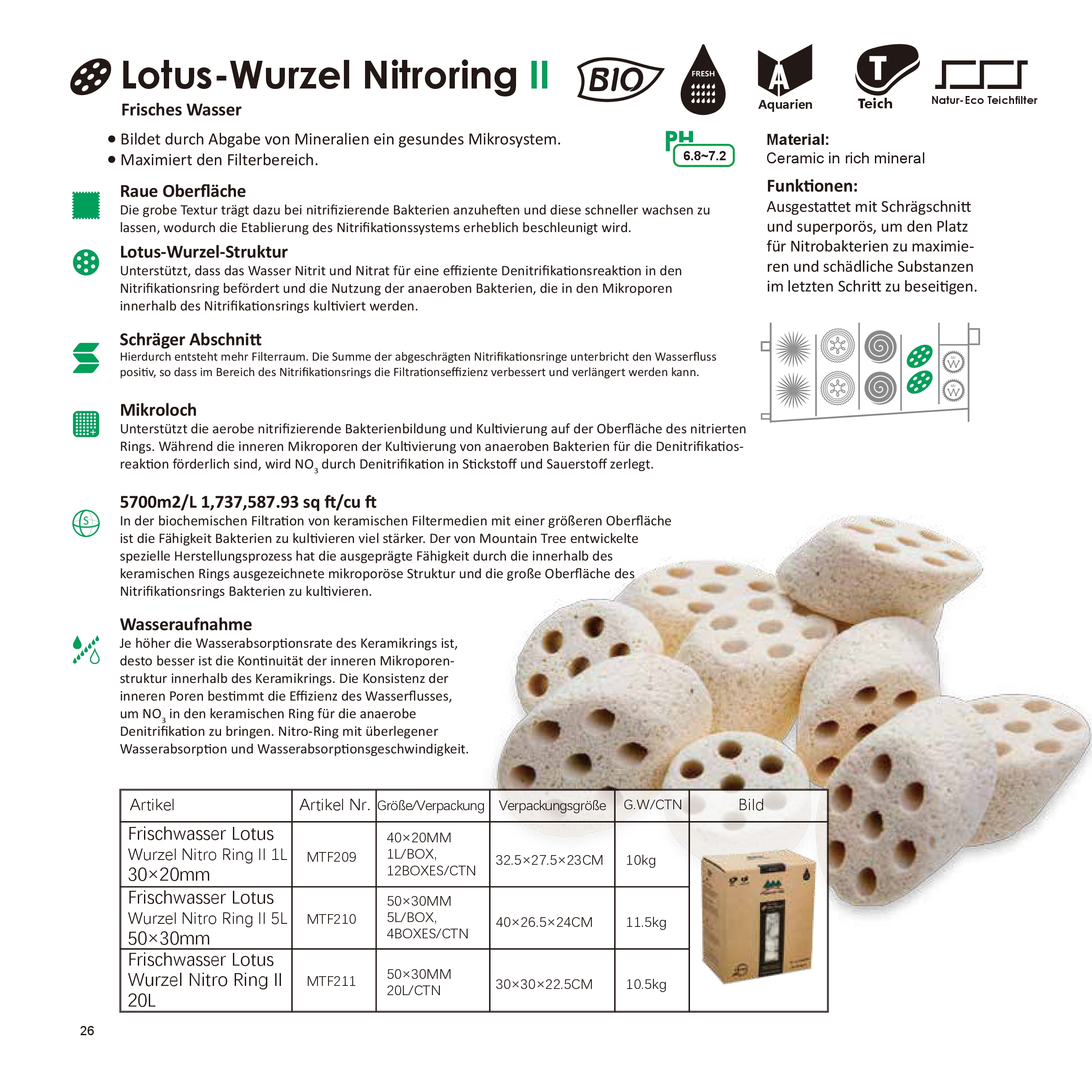 Die poröse Oberfläche mit schrägen Abschnitt bietet eine riesige Ansiedlungsfläche von 5700 m²/l und sorgt für eine Menge Platz auf wenig Raum für Filtrationsbakterien.
