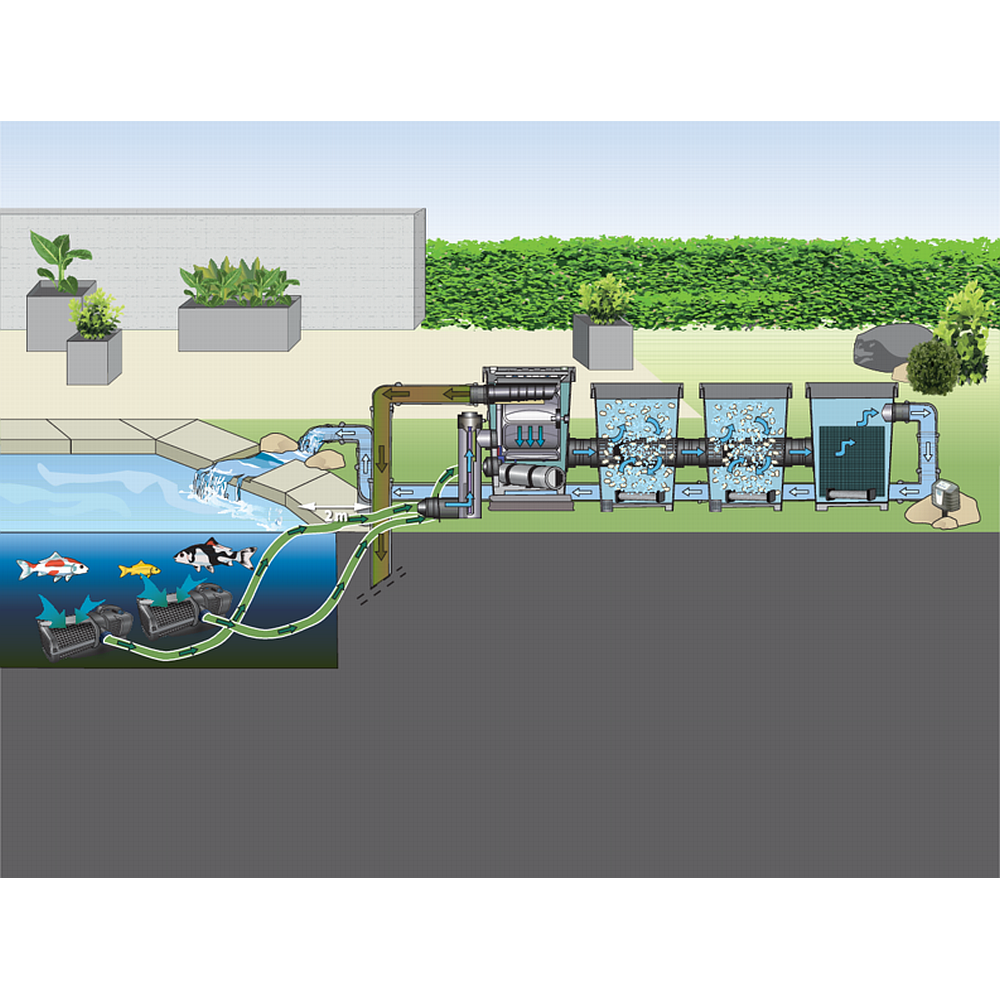 Die Vollautomatische Reinigung des Trommelfilters führt zu wenig Aufwand und Pflege in der Reinigung des Filters und gewährt dem Nutzer maximalen Komfort an seinem Koiteich.