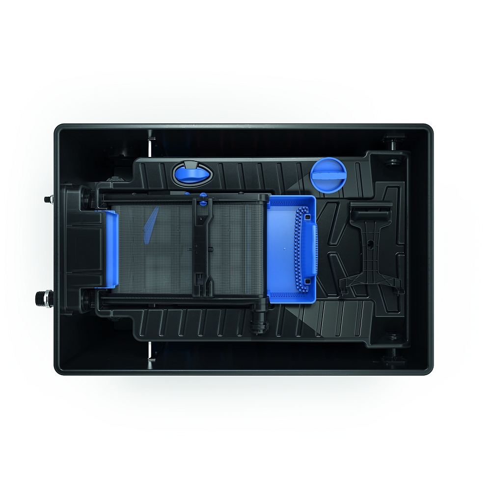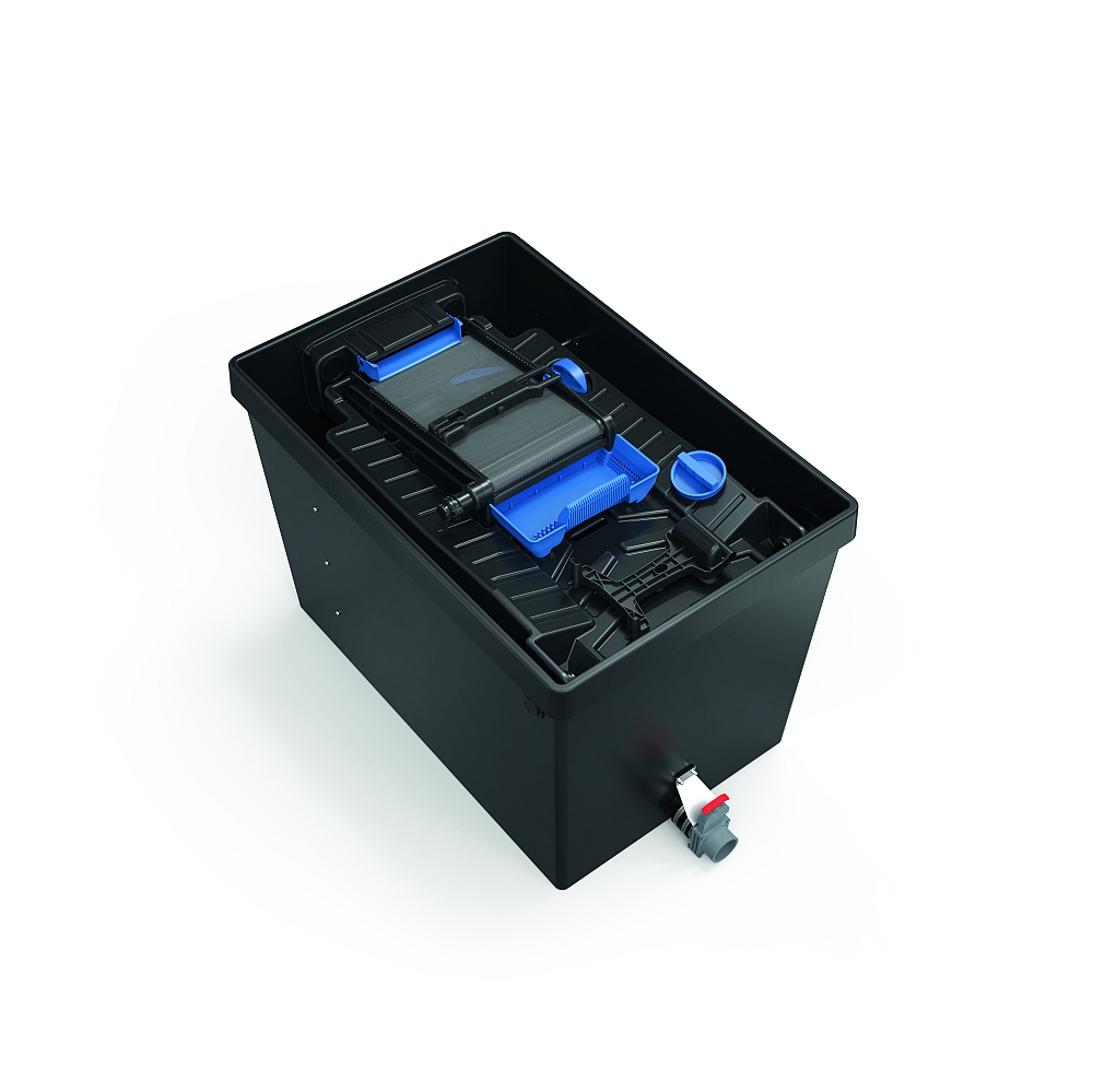 Durch sein kompaktes Endlosband am Eingang des Filters wird der grobe Schmutz aus dem Teich automatisch aufgefangen und landet durch das drehende Band in einem entnehmbaren Auffangkorb.