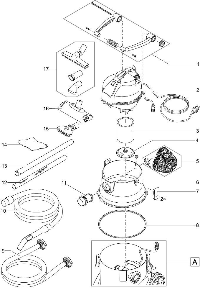 - Im Lieferumfang enthalten: 4 robuste Aluminiumrohre, spezielle Fadenalgendüse, verbreiterte Universaldüse, Flächendüse, Nasssaugbürste, Bürstendüse, Schmutzauffangbeutel, 5 m langer Saug- und 10 m langer Ablaufschlauch