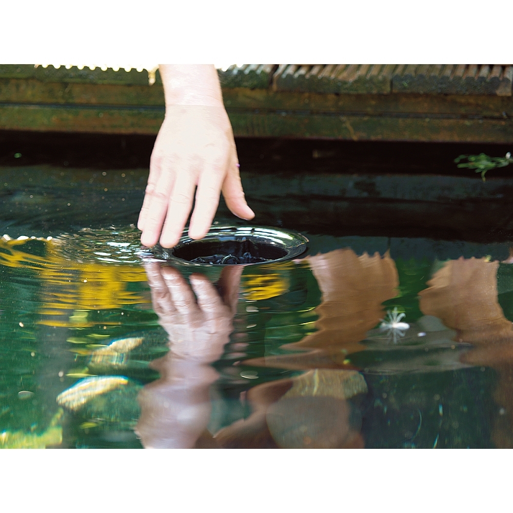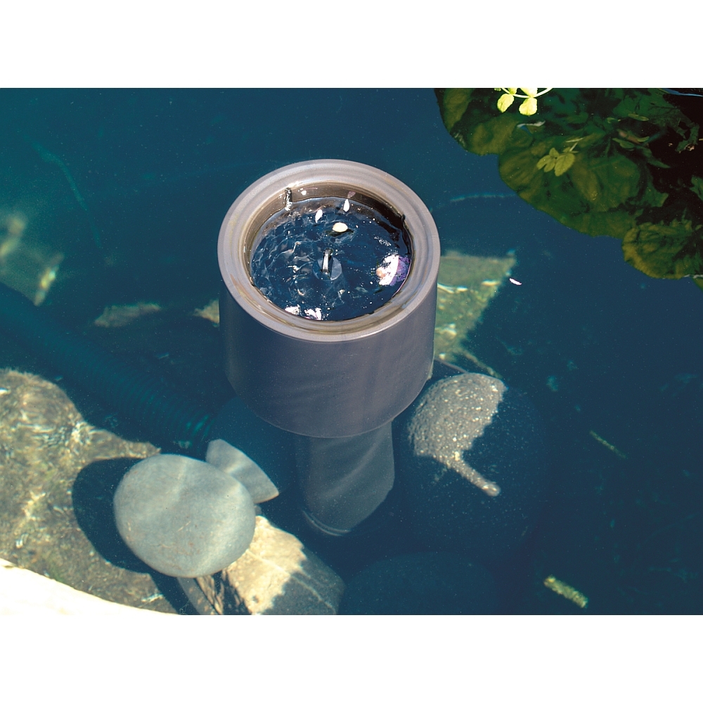 Mit einer separaten Pumpe zwischen 8.000 – 20.000 Liter Leistung und einer Beschwerung des Standfußes durch Steine kann der Teich (Koiteich, Gartenteich, Schwimmteich) auf bis zu 40m² Oberfläche (Blätter, Blütenstaub, Äste) abgesaugt werden.