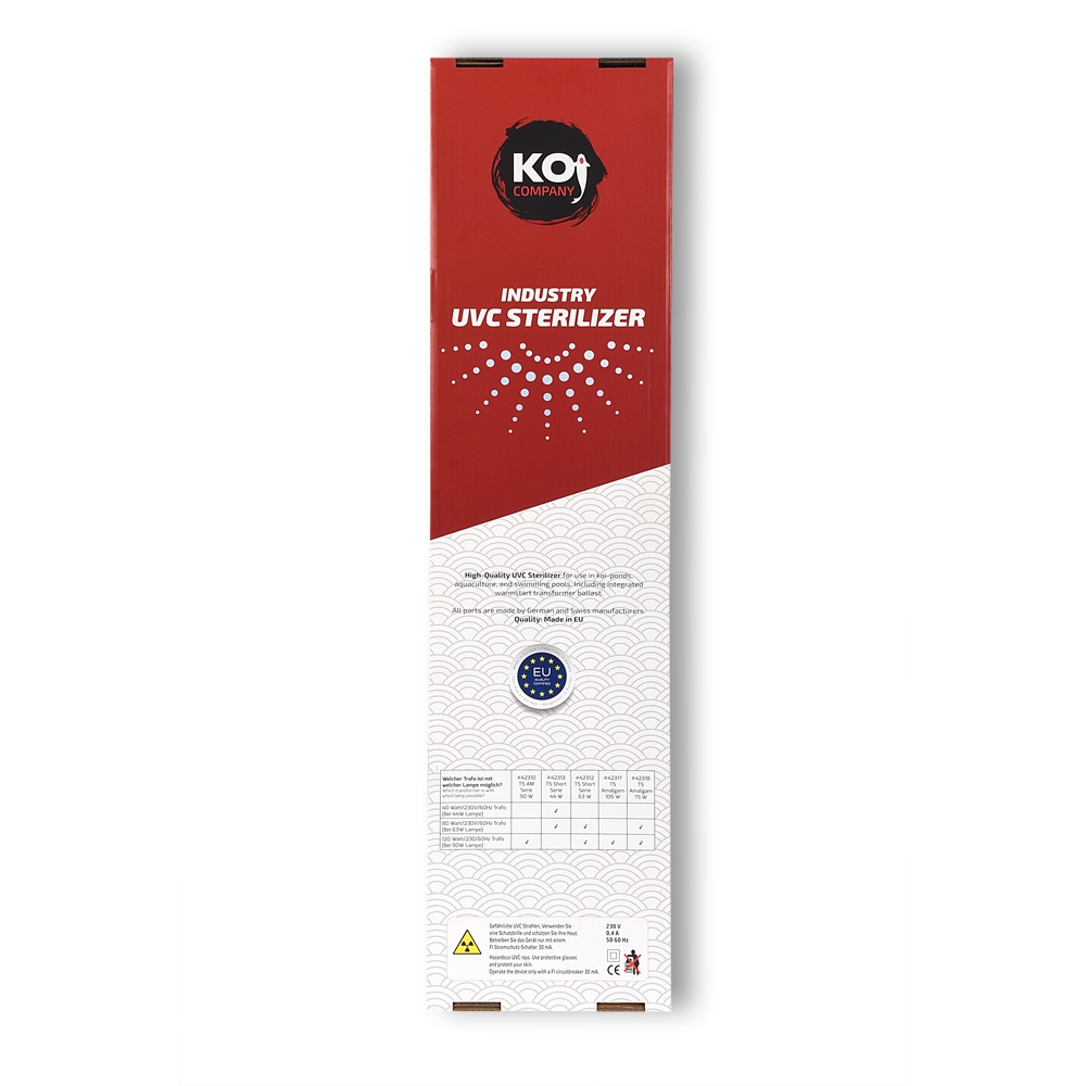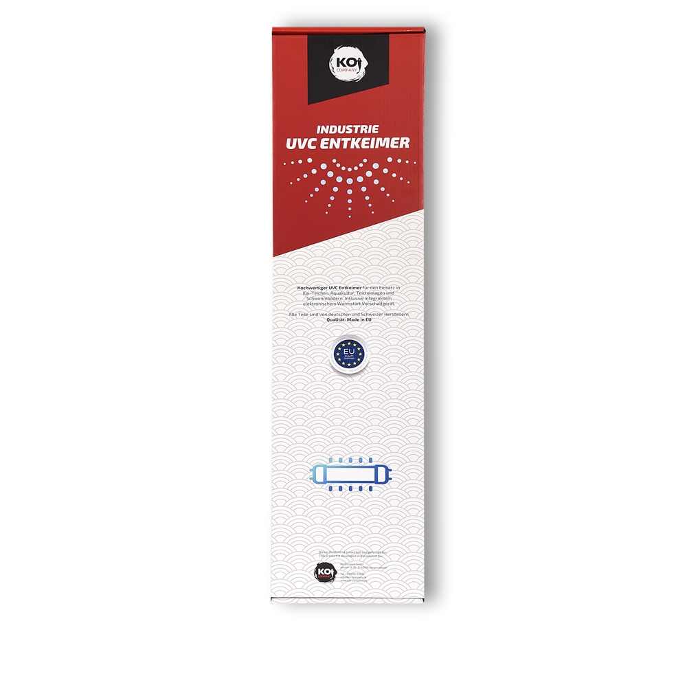 Die elektronische Hochvoltanlage erkennt, welche Lampe sie eingesetzt haben. So können Sie bei Bedarf die Lampenleistung einfach erhöhen oder reduzieren, indem sie lediglich die Lampe austauschen. Das Gerät ist für verschiedene Lampenstärken geeignet. Diese Industrie -UVC hat ein wesentlich breiteres Spektrum als eine normale UVC. Dies macht sich in der Haltbarkeit der Lampen bemerkbar, welche erst nach 16.000 Stunden ausgetauscht werden müssen.