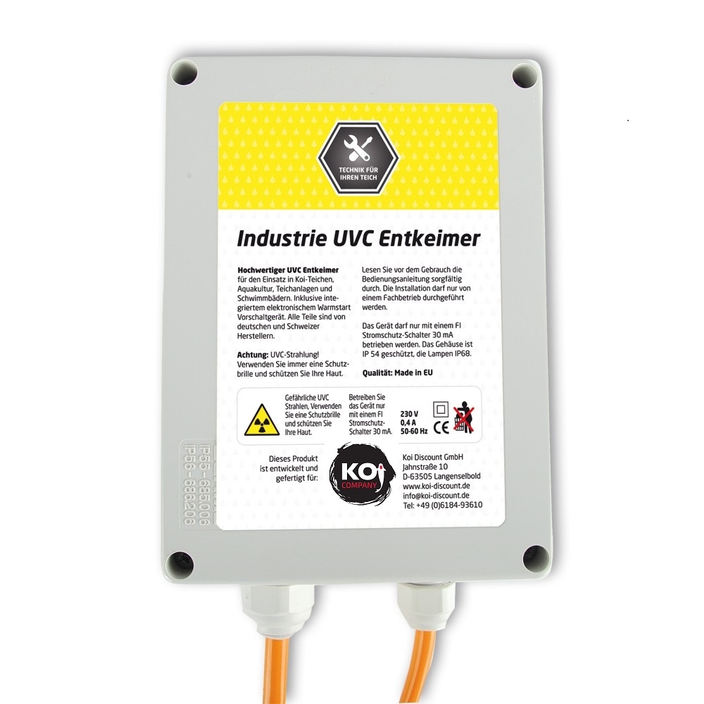 Die elektronische Hochvoltanlage erkennt, welche Lampe sie eingesetzt haben. So können Sie bei Bedarf die Lampenleistung einfach erhöhen oder reduzieren, indem sie lediglich die Lampe austauschen. Das Gerät ist für verschiedene Lampenstärken geeignet. Diese Industrie -UVC hat ein wesentlich breiteres Spektrum als eine normale UVC. Dies macht sich in der Haltbarkeit der Lampen bemerkbar, welche erst nach 16.000 Stunden ausgetauscht werden müssen.