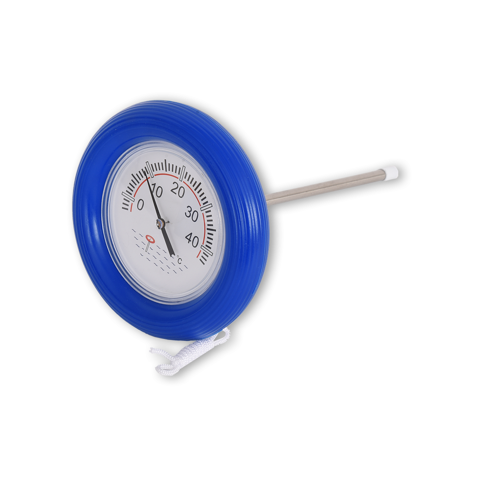 Dieses Thermometer hat einen Durchmesser von 18 cm und ist aus rostfreiem Edelstahl, der Rand besteht aus einem Weichschaum-Schwimmkörper mit Befestigungsleine.