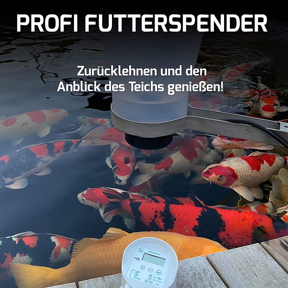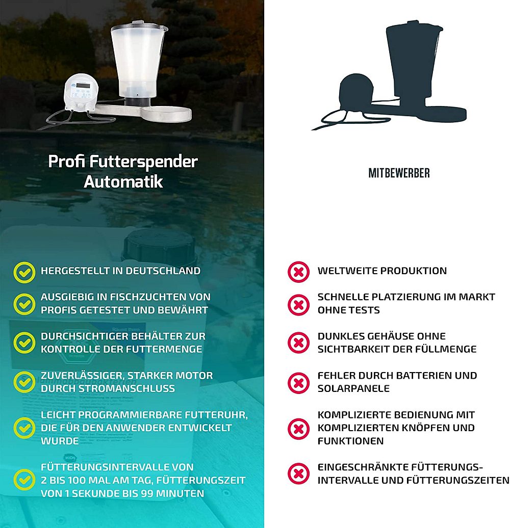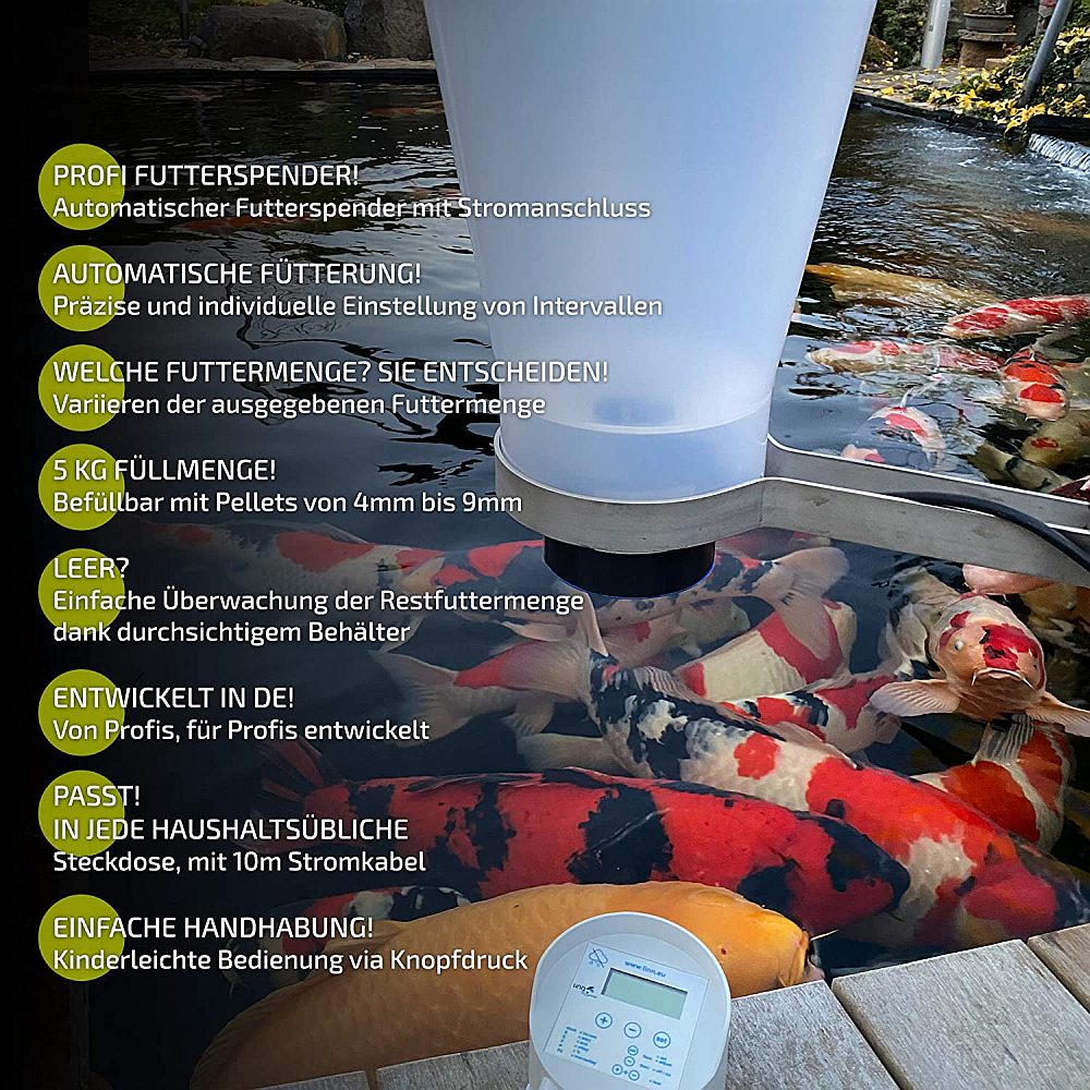 Mit dem Profi -Futterspender Automatik bieten wir Ihnen eine echte Alternative zu den solar- und batteriebetriebenen Futterautomaten an. Mit seinem 230 Volt Anschluss arbeitet er zuverlässig und unabhängig von Batterie und Sonne. Das Futter (2,5 kg) wird mit einem kleinen Getriebemotor und Dosierfingern genau in der gewünschten Menge aus dem Futterbehälter transportiert. Futterhäufigkeit und Dauer lassen sich mit der Futteruhr sekundengenau und einfach einstellen. Dabei müssen Sie nicht groß rechnen, Sie stellen einmal die Fütterungszeit und die Intervalle ein, dann errechnet Ihnen die Futteruhr automatisch die Fütterungen. Der Futterautomat wird mit der dazugehörigen Halterung komplett montiert ausgeliefert, um Ihn direkt über dem Teich zu platzieren. Die Edelstahl-Wandhalterung (25 cm) kann neben dem Teich an einer Stange, Wand oder Brett befestigt werden. Die Pellets fallen aus dem Automat gerade herunter. Seine Entwicklung und Produktion stammt komplett aus Deutschland.