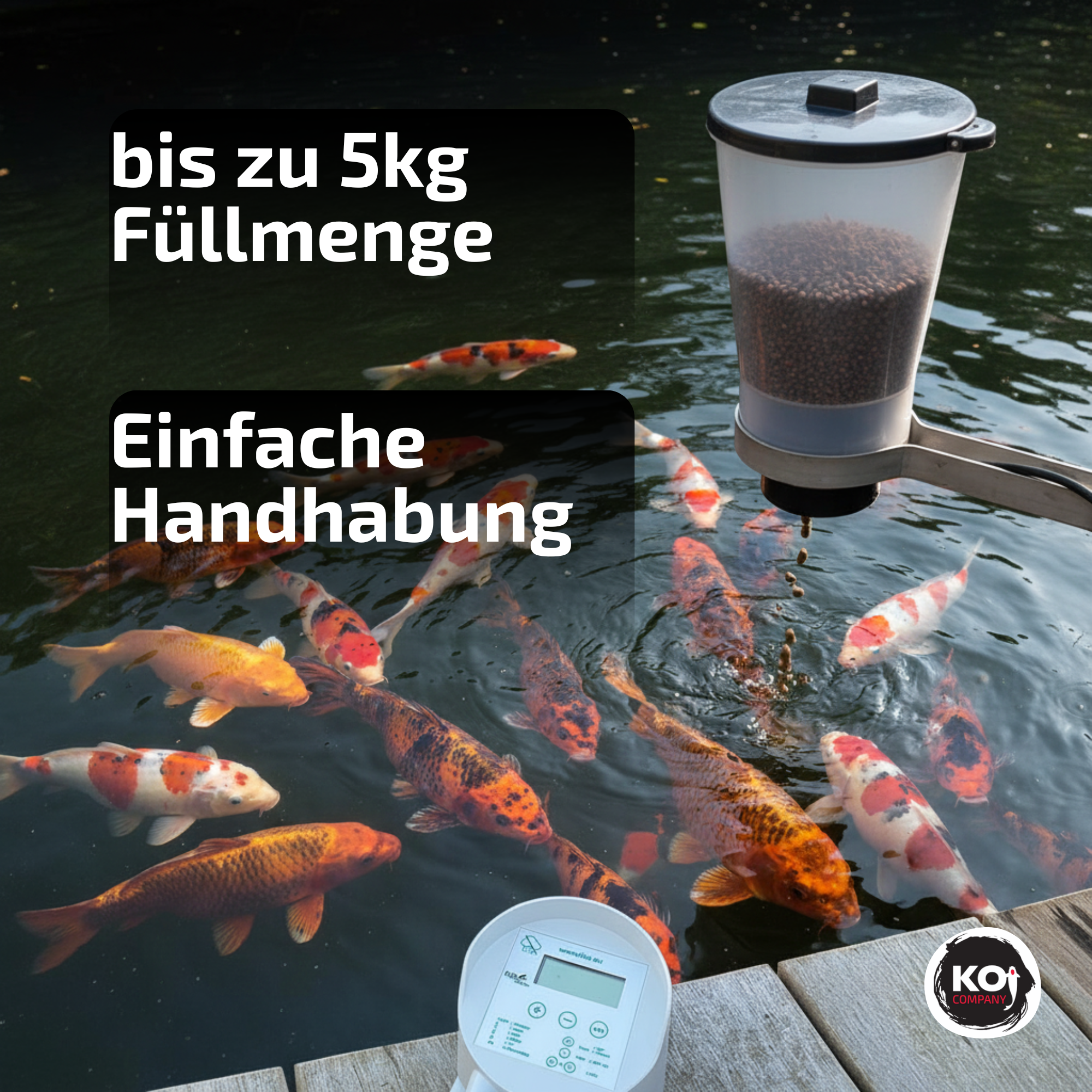 Der Futtertrichter sollte immer komplett bis oben befüllt werden, damit das leichte Koifutter sich ordentlich setzen kann und nicht einfach aus dem offenen Trichter raus rutscht.