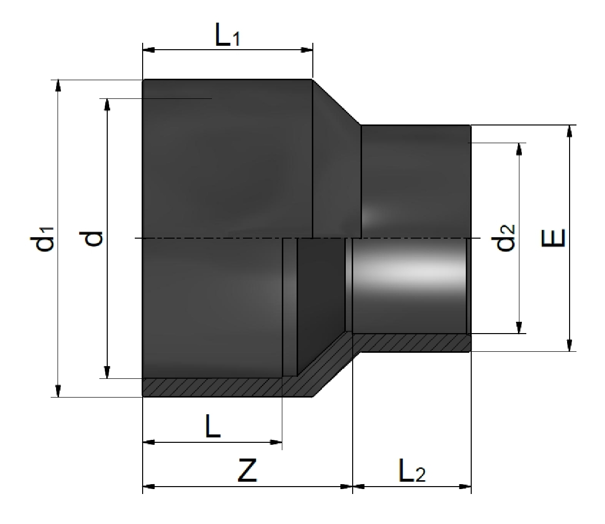 (d) Innendurchmesser links (d1) Außendurchmesser links (d2) Innendurchmesser rechts (E) Außendurchmesser rechts L L1 L2 Z Gewicht