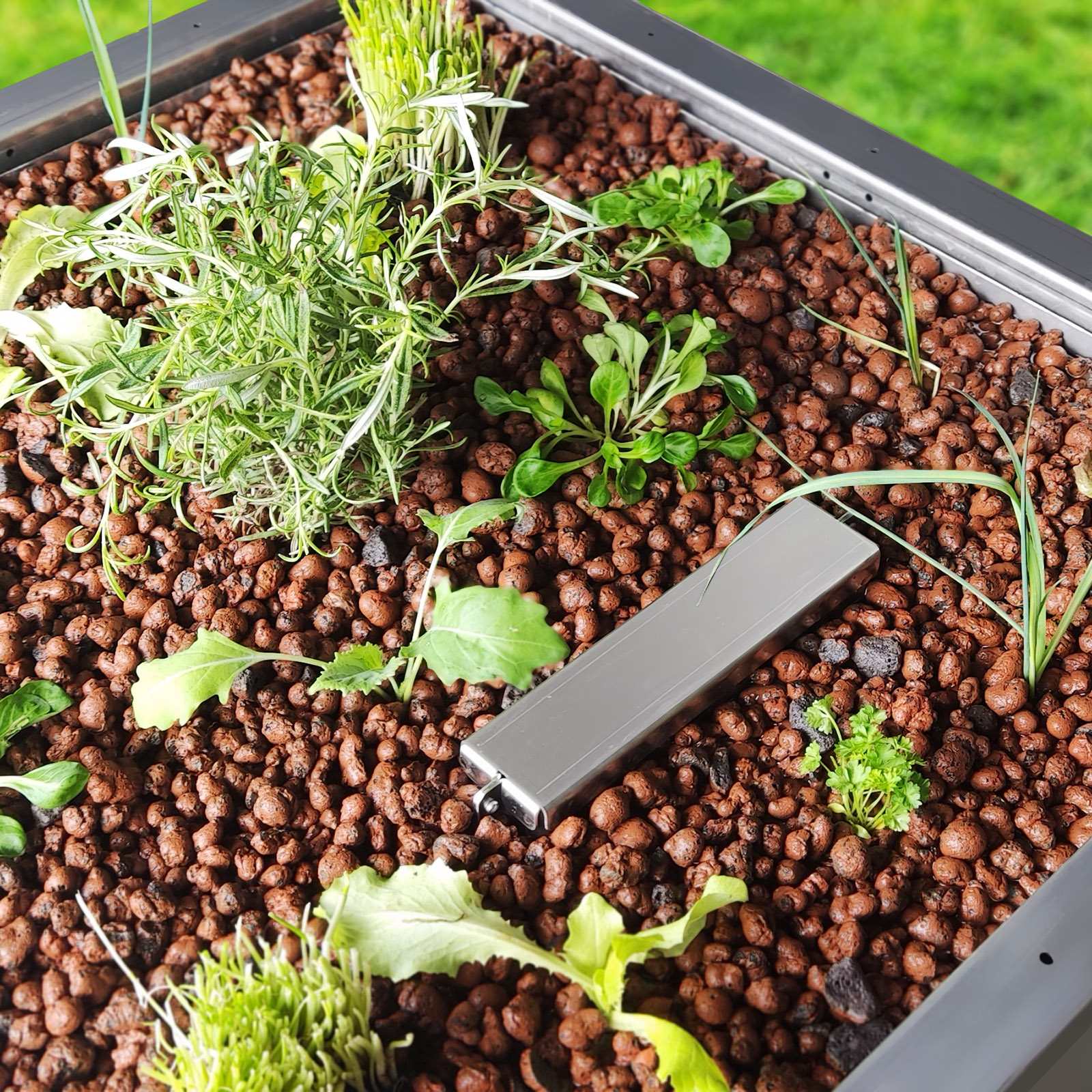 Die im Substrat gepflanzten Salate, Kräuter oder Zierpflanzen werden stets optimal mit Wasser versorgt, die im Teich vorhandenen Nährstoffe dienen als Naturdünger für Ihre Pflanzen. Durch eine Öffnung kann ein Luftschlauch zum Belüften installiert werden.