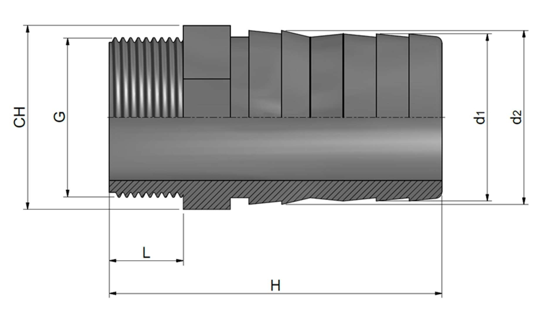 (G) Durchmesser Gewinde (d1) Durchmesser rechts (d2) Durchmesser (größter) rechts  (L) Länge Gewinde (H) Gesamtlänge (CH) maximaler Durchmesser Gewicht