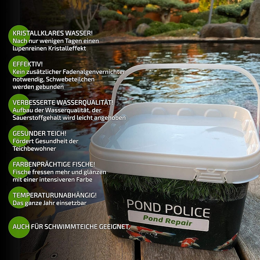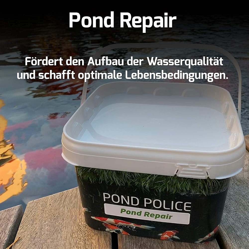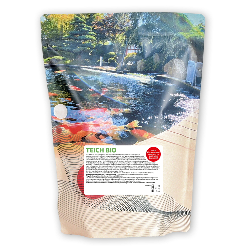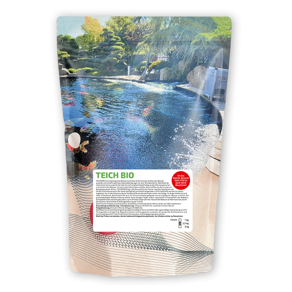 Teich Bio (Pond Repair) ist eine biologische Wasserkontrolle. Es fördert den Aufbau der Wasserqualität und schafft optimale Lebensbedingungen für alle Teichbewohner. Das Material natürlichen Ursprungs fördert die Vermehrung Schadstoff abbauender Mikroorganismen und reichert das Wasser mit wertvollen Mineralien und Bio-Aktivstoffen an, die in unserem Ausgangswasser fehlen. Teich Bio (Pond Repair) fördert die Gesundheit der Fische, regt den Appetit an und fördert die Farbenpracht. Der Sauerstoffgehalt wird leicht angehoben und Schadstoffe werden schneller abgebaut.