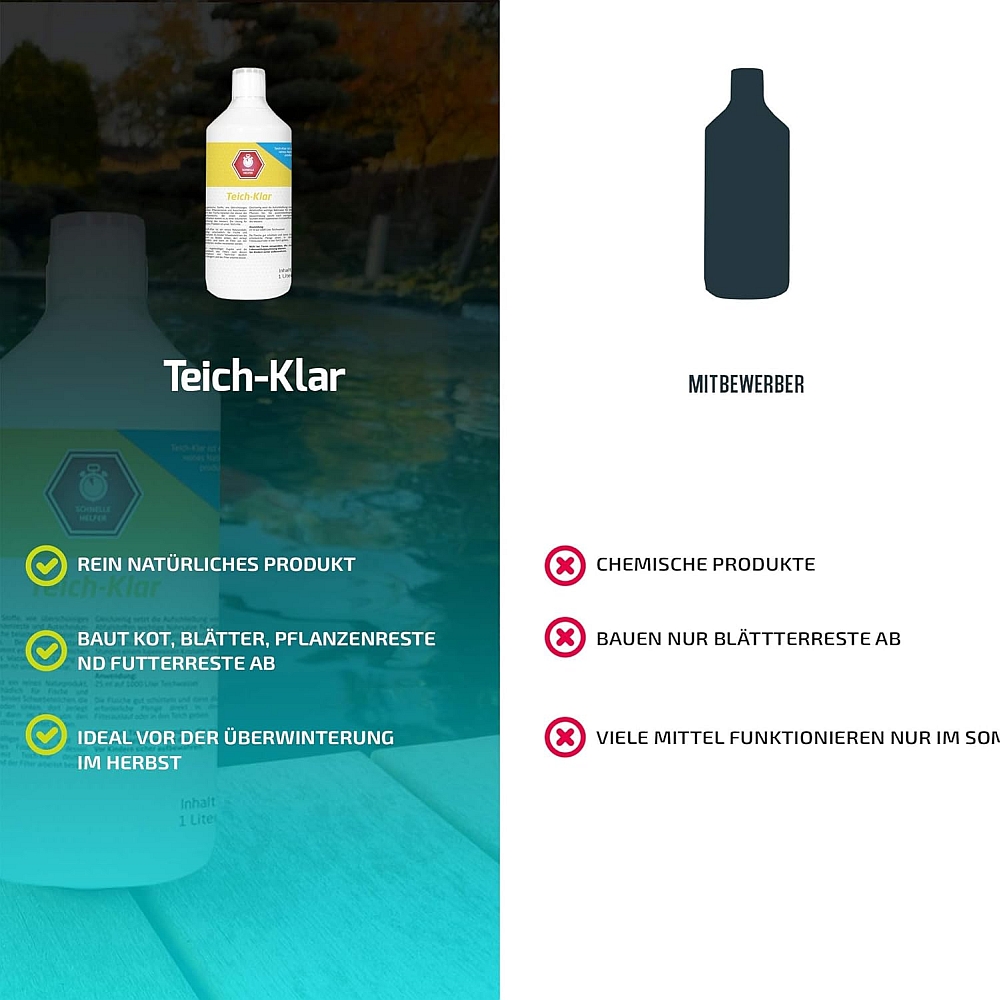 Teich-Klar ist ein reines Naturprodukt, völlig unschädlich für Fische und Pflanzen. Es bindet Schwebeteilchen, die dann zu Boden sinken, dort zerlegt werden und im Filter von den Bakterien restlos verarbeitet werden. Es eignet sich im Herbst optimal dazu, die organischen Reste vor der Überwinterung abzubauen.