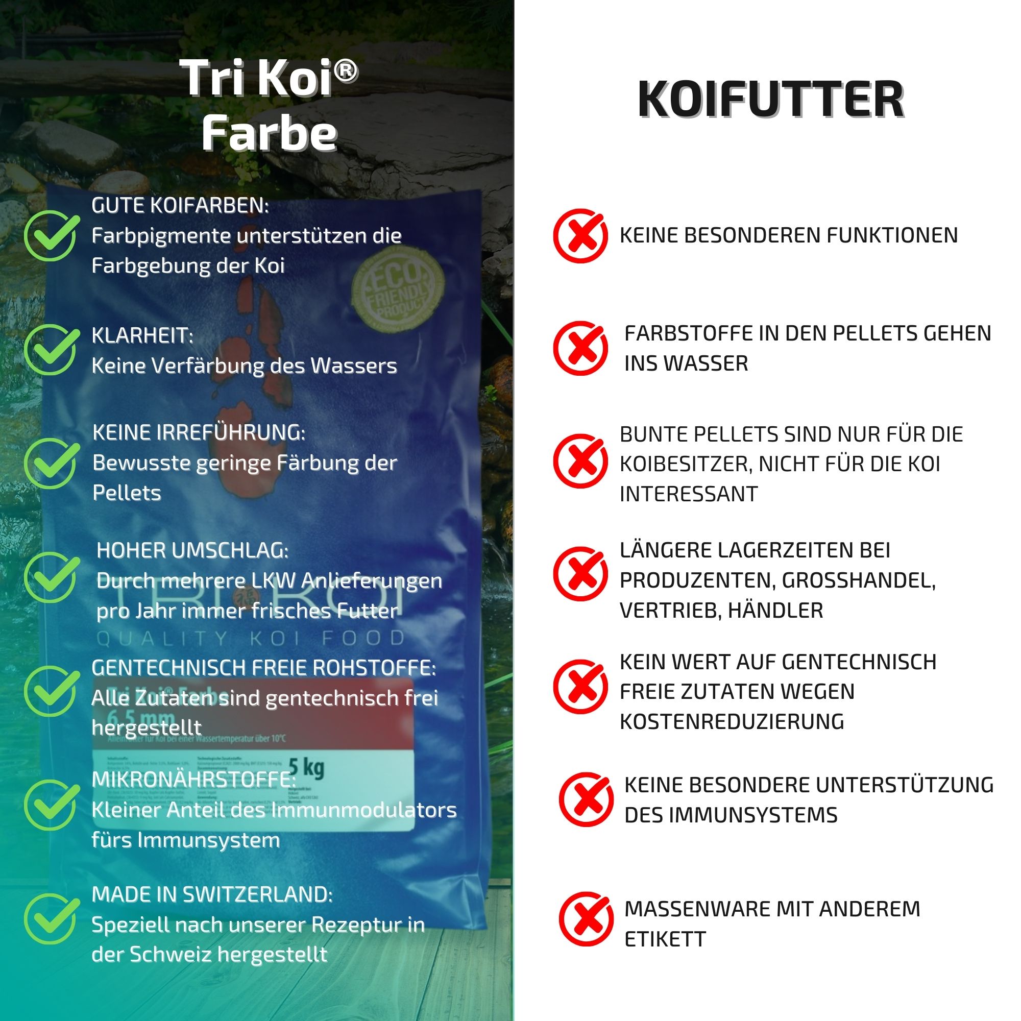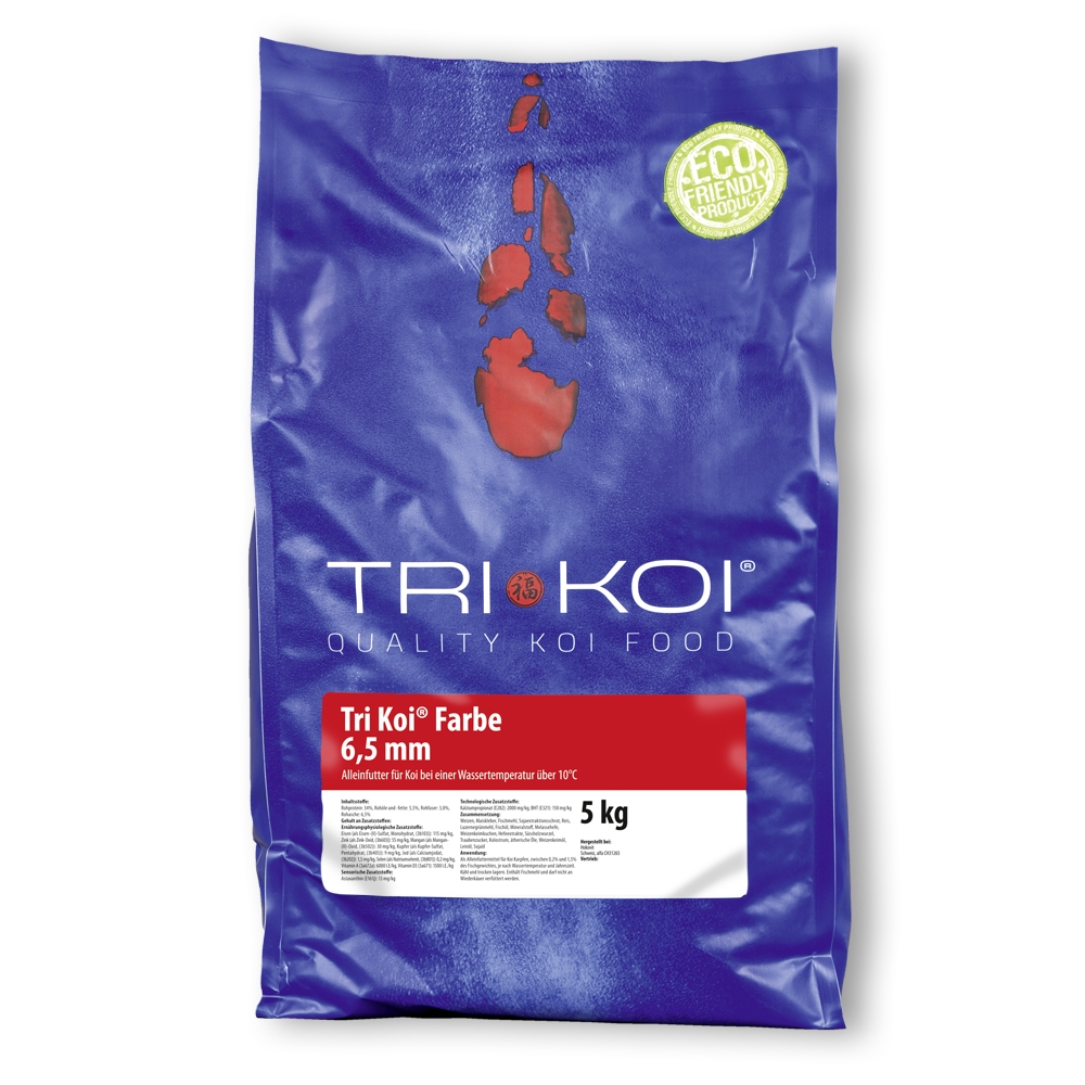 Tri Koi® Farbe unterstützt durch die spezielle Zusammensetzung die Farbpigmente der Koi, die in der Haut liegen, um die Farben gut hervorzubringen. Es handelt sich um ein Alleinfutter, es kann aber auch mit anderen Futtersorten vermischt werden.