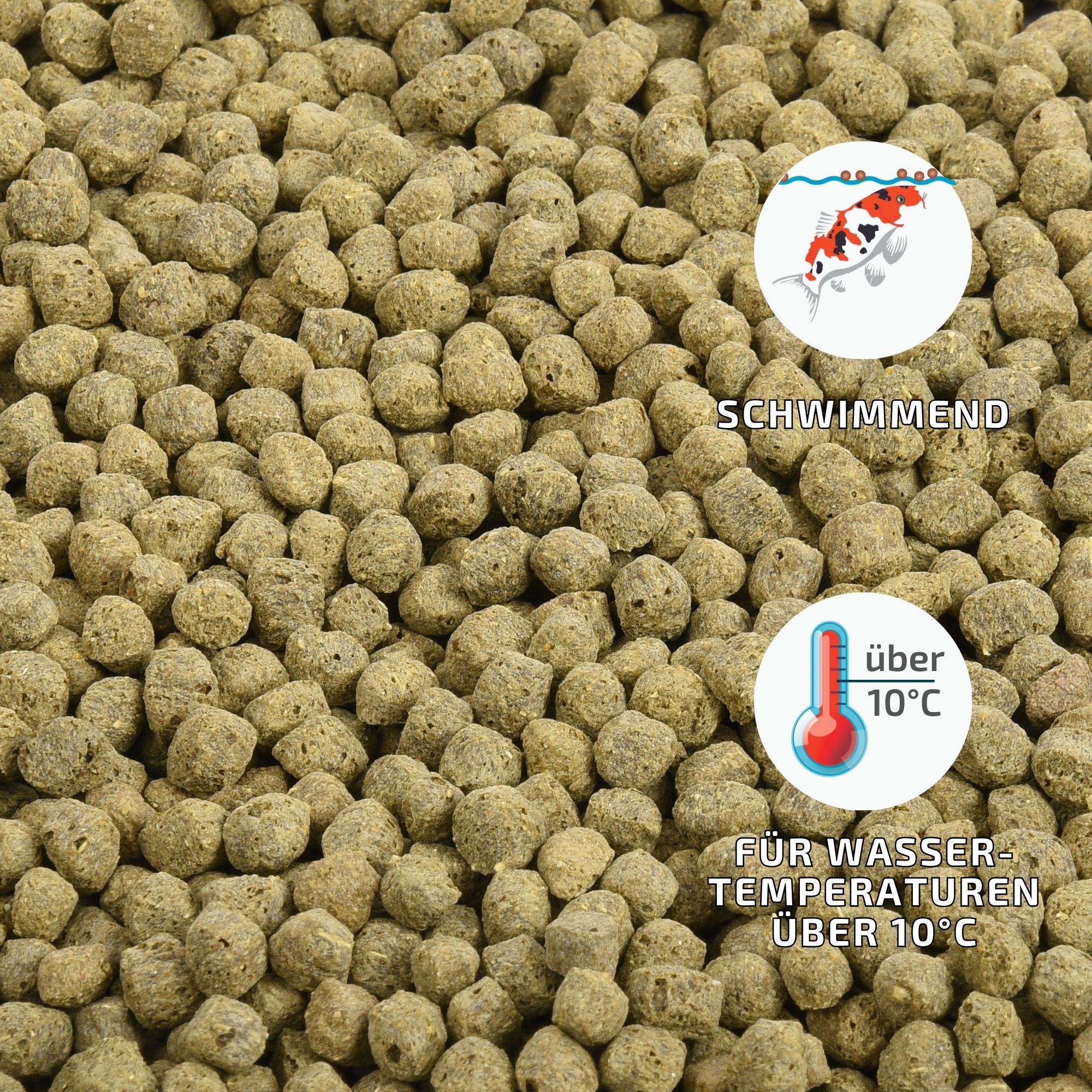 Füttern Sie Ihre Koi in Abhängigkeit von der Wassertemperatur 1-3 x täglich. Als Alleinfuttermittel für Koi Karpfen, zwischen 0,2% und 1,5% des Fischgewichtes, je nach Wassertemperatur und Jahreszeit.