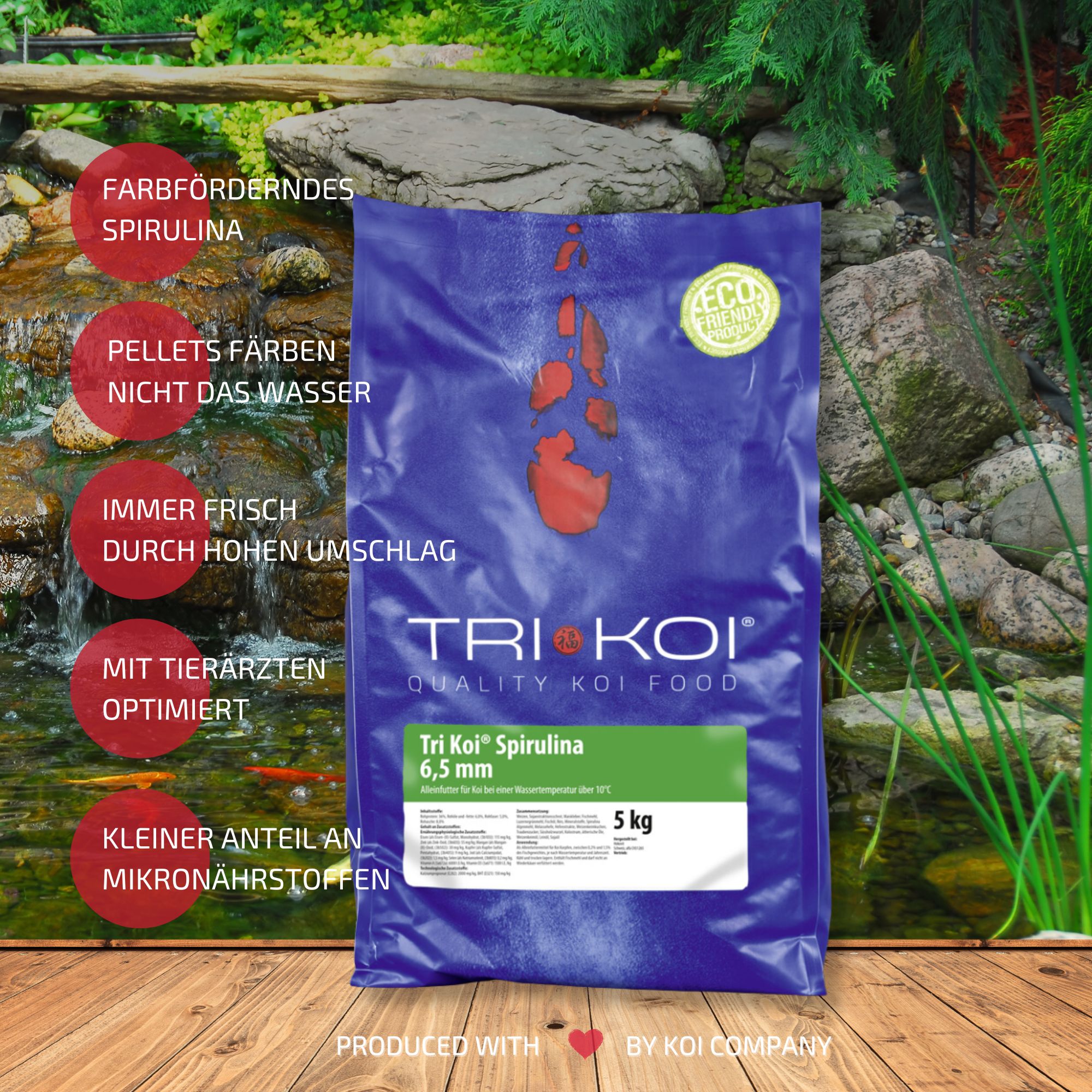 Tri Koi® Spirulina steht für eine optimale Farbe. Das Rot verstärkt sich und das Weiß wird nicht verfärbt. Es handelt sich um ein Alleinfutter, es kann aber auch mit anderen Futtersorten vermischt werden.