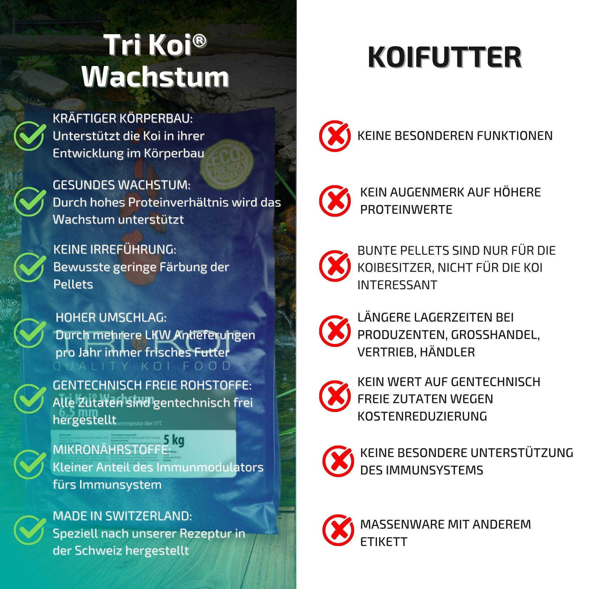 Tri Koi® Wachstum: hier wurde besonderes Augenmerk auf die Entwicklung der Koi gelegt. Mit diesem Futter werden Ihre Koi rasch größer, ohne dass Sie verfetten. Es handelt sich um ein Alleinfutter und Konditionsfutter, es kann aber auch mit anderen Futtersorten vermischt werden.