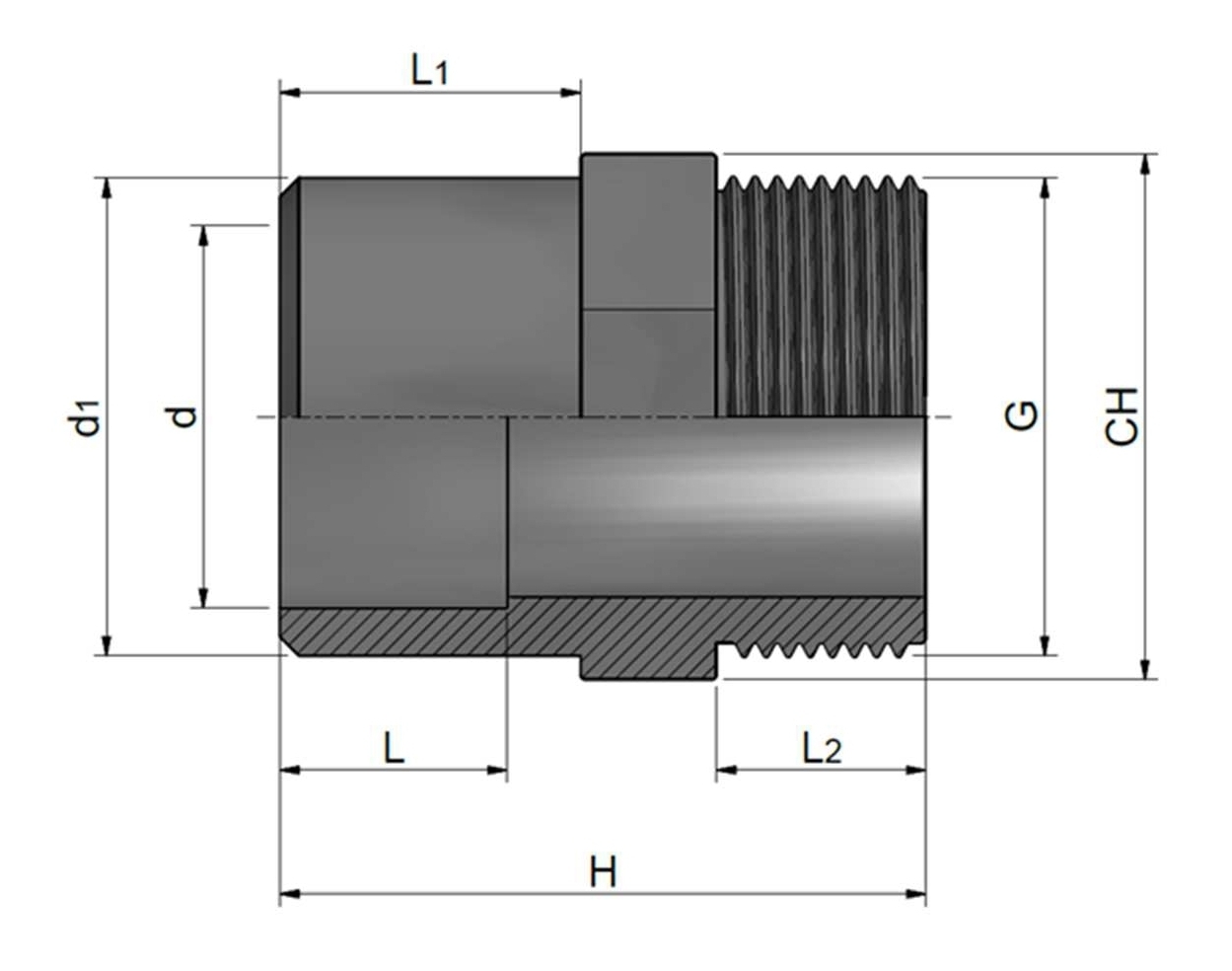 (d) Innendurchmesser links (d1) Außendurchmesser links (G) Durchmesser Gewinde L (L1) Länge Klebestutzen (L2) Länge Gewinde (H) Gesamtlänge (CH) Durchmesser (größter) Gewicht