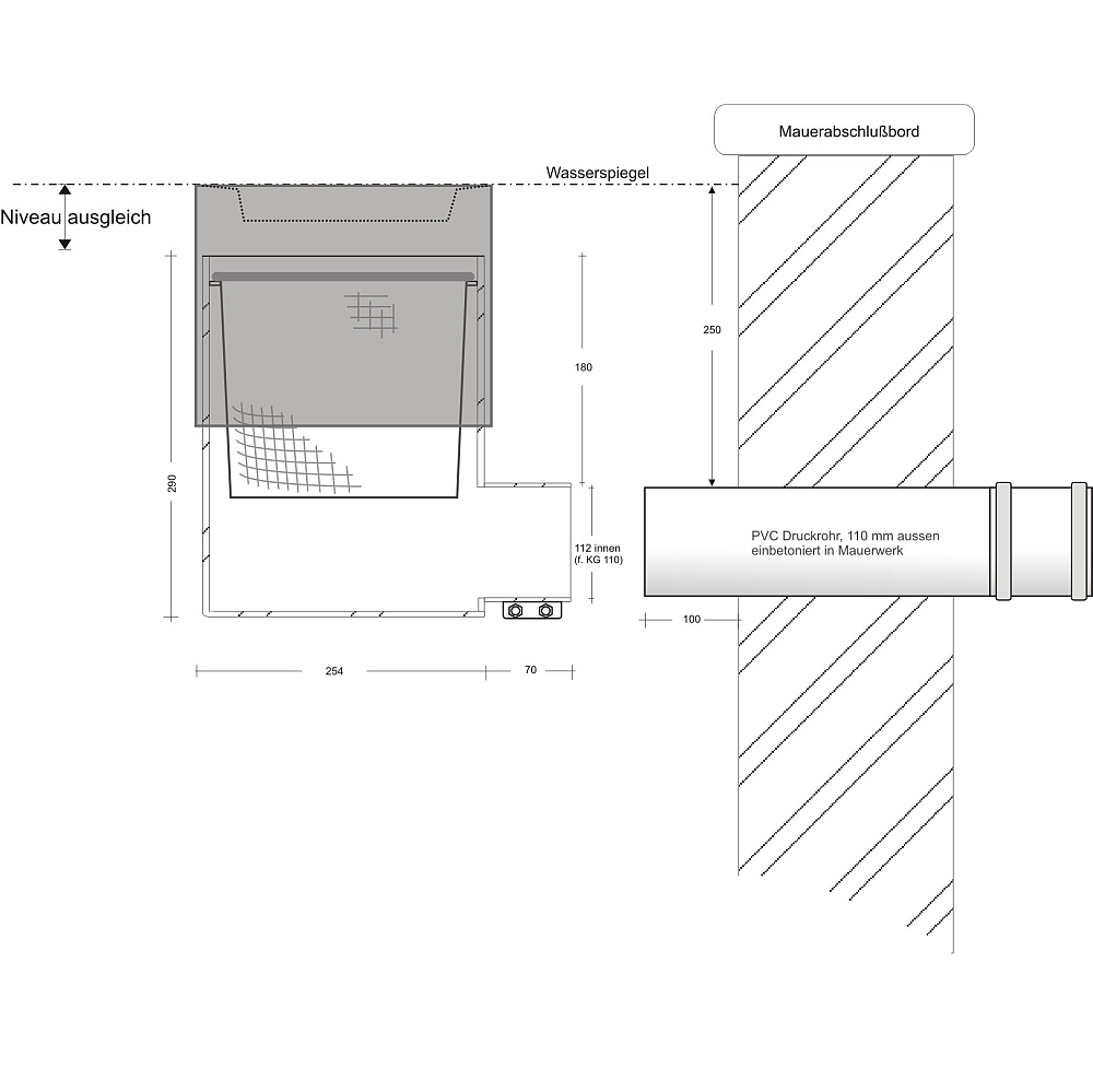 Der Skimmer für den Teich-Neubau. Die Rohrdurchführung in der Wand wird in exakter Höhe positioniert, dann muss nur noch der Skimmer angeschlossen werden. Genaue Angaben finden Sie im Einzeldatenblatt.