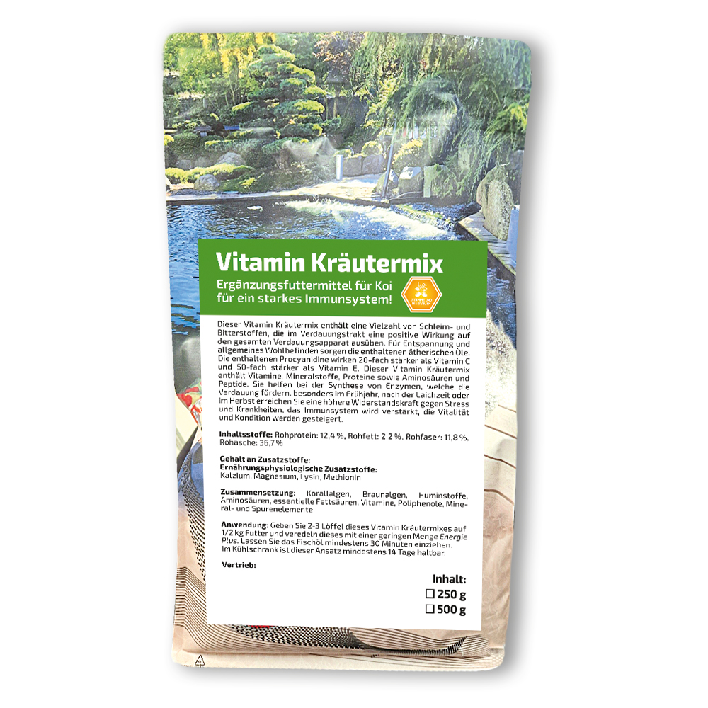 Für Entspannung und allgemeines Wohlbefinden sorgen die enthaltenen ätherischen Öle. Die enthaltenen Procyanidine wirken 20-fach stärker als Vitamin C und 50-fach stärker als Vitamin E. Koi Company Kräutermix enthält Vitamine, Mineralstoffe, Proteine sowie Aminosäuren und Peptide. Sie helfen bei der Synthese von Enzymen, welche die Verdauung fördern.